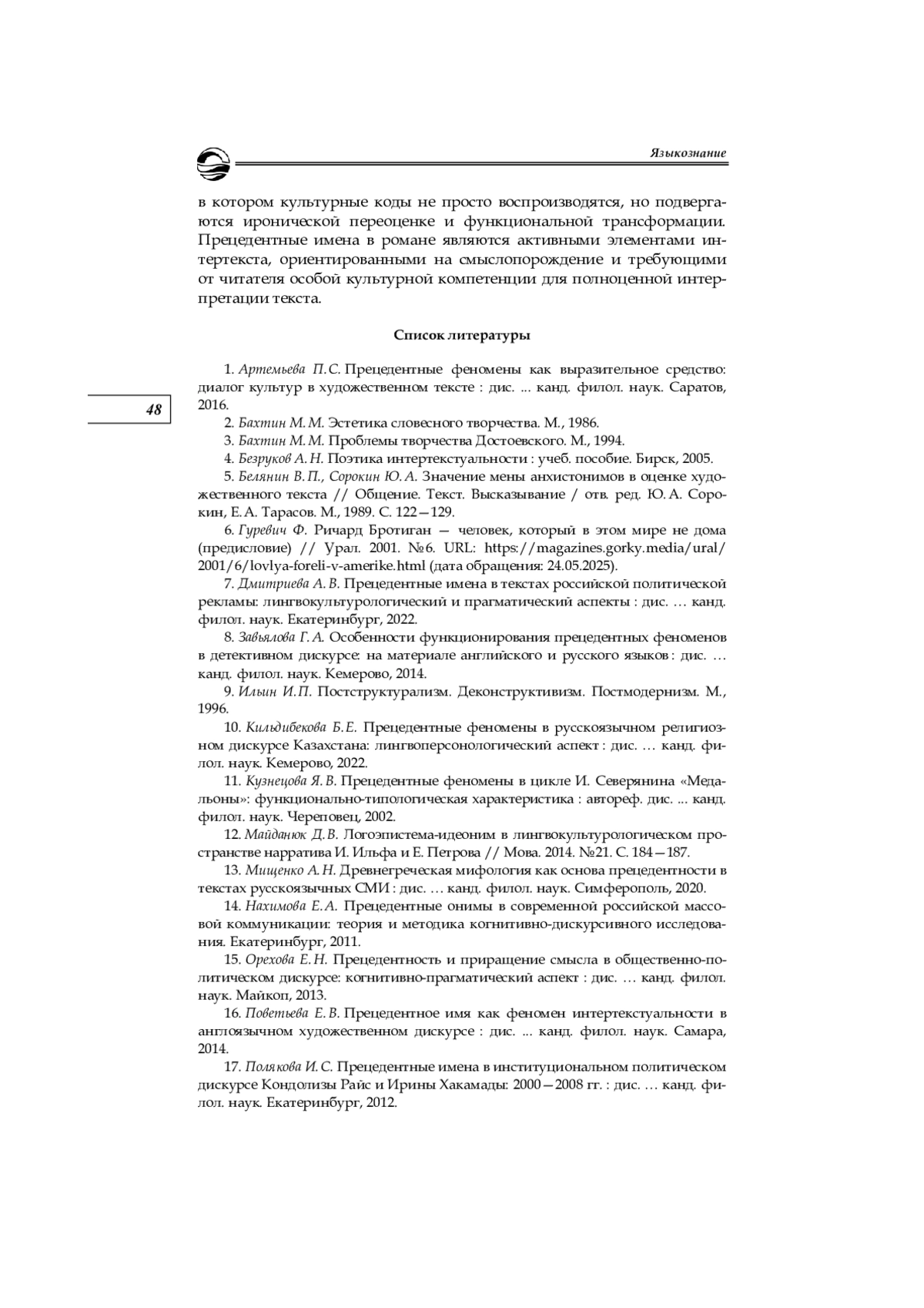 1. Артемьева П. С. Прецедентные феномены как выразительное средство: диалог культур в художественном тексте: дис.. канд. филол. наук. Саратов, 2016. EDN: WKFBDN