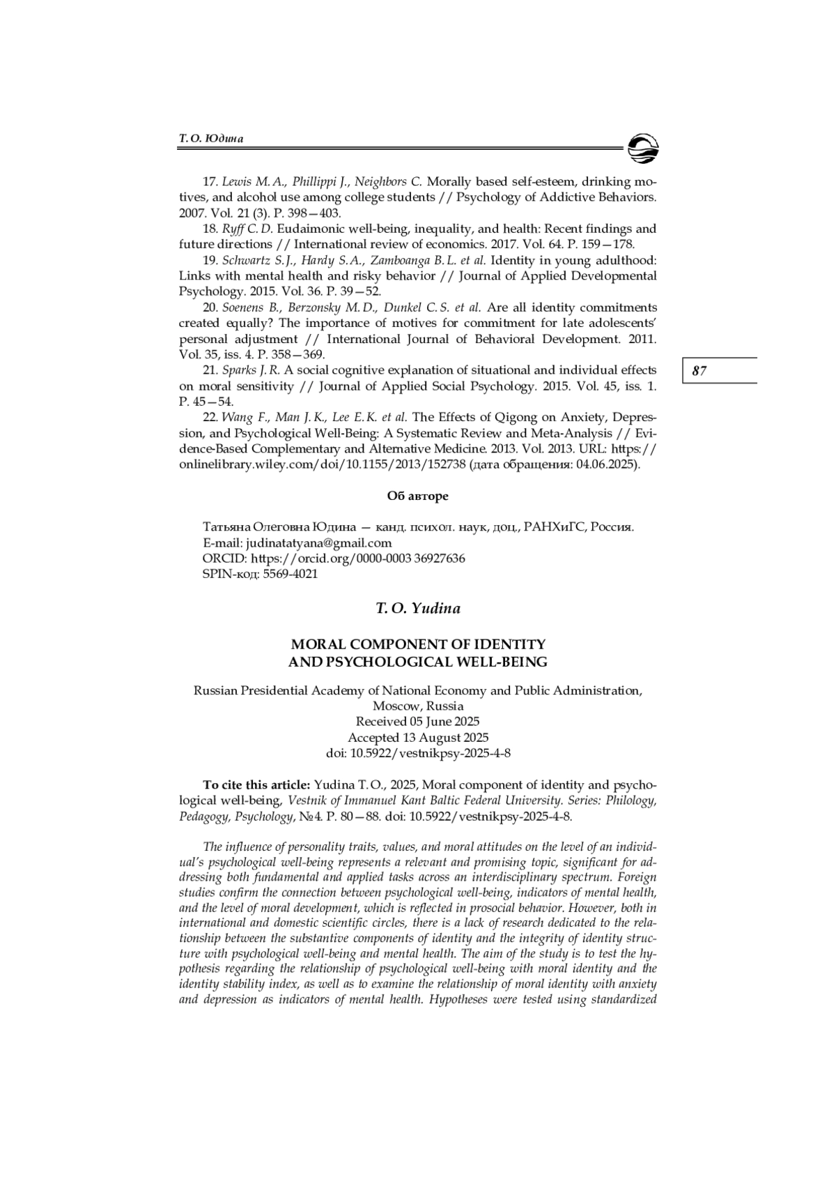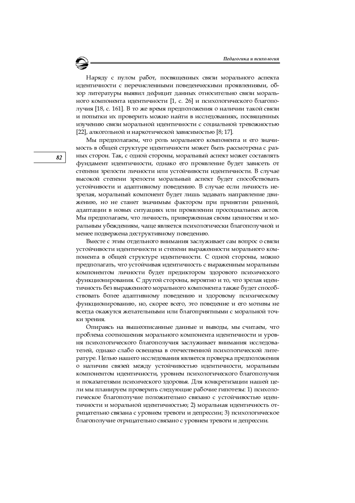 Влияние личностных черт, ценностей и моральных установок на уровень психологического благополучия личности представляет собой актуальную и перспективную тему, существенную для решения фундаментальных и прикладных задач междисциплинарного спектра. Зарубежные исследования подтверждают связь психологического благополучия с показателями психического здоровья и уровнем морально-нравственного развития, отражающегося в просоциальном поведении. Однако как в зарубежных, так и в отечественных научных кругах существует дефицит исследований, посвященных взаимосвязи содержательных компонентов идентичности и целостности структуры идентичности с психологическим благополучием и психическим здоровьем. Цель исследования — проверить гипотезу о связи психологического благополучия с моральной идентичностью и индексом устойчивости идентичности, а также изучить взаимосвязь моральной идентичности с тревожностью и депрессией как показателями психического здоровья. Проведена проверка гипотез с использованием стандартизированных методик на выборке из 127 человек, после чего выполнен корреляционный анализ полученных данных. Полученные результаты, показавшие значимую положительную корреляцию между психологическим благополучием, моральной идентичностью и индексом устойчивости идентичности, могут стать основой для дальнейших исследований в области морального развития, а также разработки практических рекомендаций