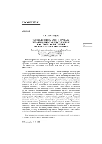 Рассматривается проблема эффективности / неэффективности речевой коммуникации, которая во многом определяется адекватностью / неадекватностью вербального и невербального поведения коммуникантов, а также проблема организации диалогического взаимодействия как процесса социального, коммуникативного, дискурсивного. Цель исследования — выявить сущностные характеристики приемов активного слушания, используемых в организации речевого общения, на основе анализа материала на английском, французском и русском языках. Научная новизна работы состоит в уточнении и выявлении отличительных признаков активного слушания (слушания в интересах собеседника) — явления малоизученного в отечественной лингвистике. Обосновывается положение о конструктивном характере приемов активного слушания как стратегии взаимопонимания и согласованности действий коммуникантов. Эффективное использование приемов активного слушания обусловливается наличием совокупности коммуникативно-прагматических факторов, включающих социальнопсихологические характеристики коммуникантов, ситуацию и тему взаимодействия. Полученные результаты показали, что несоблюдение / нарушение правил и принципов активного слушания препятствует установлению и поддержанию контакта собеседников на протяжении всего процесса общения. Подобные отклонения приводят к нарушению общности говорящего и слушающего, нарушению смысловой координации реплик коммуникативных партнеров. Как следствие, не обеспечивается полноценная реализация коммуникативных интенций и установок говорящих, что становится причиной неэффективности речевого взаимодействия и, как правило, приводит к возникновению ситуаций псевдокоммуникативных контактов