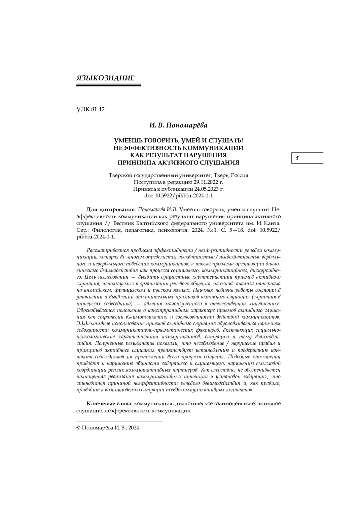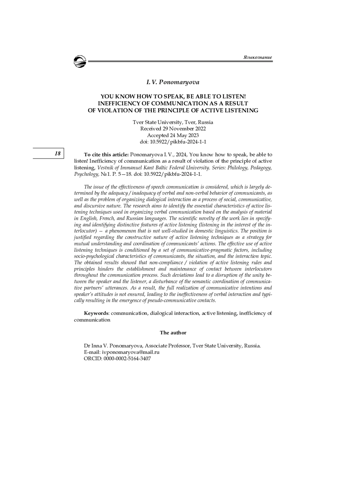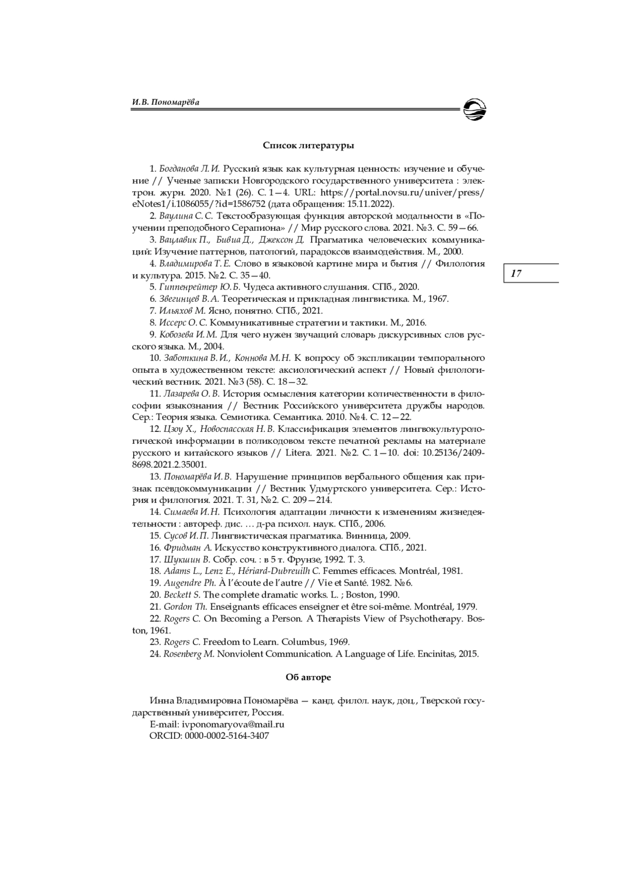 13. Пономарёва И. В. Нарушение принципов вербального общения как признак псевдокоммуникации // Вестник Удмуртского университета. Сер.: История и филология. 2021. Т. 31, № 2. С. 209-214. EDN: ZUGHID