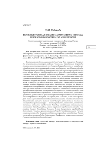 Профессиональная деятельность переводчиков чаще всего реализуется в отраслевых профессиональных дискурсах, особенно в регионально обусловленных. Отраслевые дискурсы как институциональный тип дискурса обнаруживают поли- и интердискурсивный характер, детерминирующий сложное, поливалентное переводческое действие. Объектом данного исследования, выполненного на основе многолетнего переводческого опыта автора, является садоводческий дискурс в двух неблизкородственных лингвокультурах (русской и немецкой), предметом исследования — дискурсивные и транслатологические особенности данного дискурса. Цель и исследовательские задачи сфокусированы на выявлении особенностей полидискурсивной природы отраслевого переводческого дискурса (на примере садоводческого). Герменевтико-интерпретативный метод и метод дискурс-анализа позволили определить и смоделировать трехкомпонентную полевую структуру отраслевого переводческого дискурса, его ядерные и смежные виды интегрированных дискурсов и тем самым подчеркнуть отличие от монодискурсивного переводческого действия. Переводчик в отраслевом полидискурсивном пространстве выстраивает свои переводческие стратегии и комплексную технологию перевода в соответствии с критериями, особенностями, доминантами, ценностями, хронотопом, участниками и прочими дискурсивно детерминированными признаками всех интегрированных дискурсов, как ядерного, так и смежных, и тем самым формирует типаж мультивалентной профессиональной личности. Показана вариативность взаимодействия ядерного и смежных типов дискурса. Установлены и описаны конститутивные признаки дискурса — полидискурсивность, глокальность, многоязычие. Определены особенности переводческого действия, составляющие аналитического и оперативного действий, выявлены группы трудностей переводческого действия в отраслевом дискурсе. Исследование выполнено в русле дискурсивного переводоведения, вносит вклад в описание прикладных аспектов переводческой деятельности в профессиональных отраслевых дискурсах, развивает интегративное переводоведение в целом и открывает перспективы для дидактической верификации полученных результатов в практической подготовке переводчиков