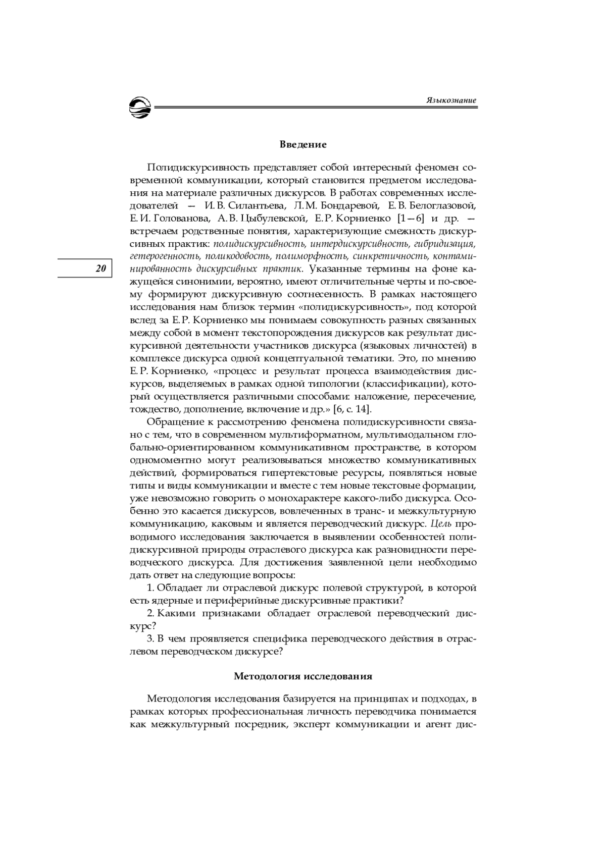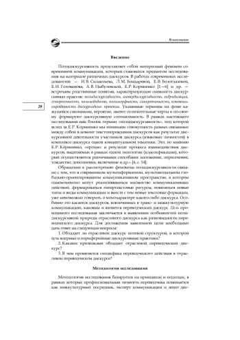 Полидискурсивность представляет собой интересный феномен современной коммуникации, который становится предметом исследования на материале различных дискурсов. В работах современных исследователей — И. В. Силантьева, Л. М. Бондаревой, Е. В. Белоглазовой, Е. И. Голованова, А. В. Цыбулевской, Е. Р. Корниенко [1—6] и др. — встречаем родственные понятия, характеризующие смежность дискурсивных практик: полидискурсивность, интердискурсивность, гибридизация, гетерогенность, поликодовость, полиморфность, синкретичность, контаминированность дискурсивных практик. Указанные термины на фоне кажущейся синонимии, вероятно, имеют отличительные черты и по-своему формируют дискурсивную соотнесенность. В рамках настоящего исследования нам близок термин «полидискурсивность», под которой вслед за Е. Р. Корниенко мы понимаем совокупность разных связанных между собой в момент текстопорождения дискурсов как результат дискурсивной деятельности участников дискурса (языковых личностей) в комплексе дискурса одной концептуальной тематики. Это, по мнению Е. Р. Корниенко, «процесс и результат процесса взаимодействия дискурсов, выделяемых в рамках одной типологии (классификации), который осуществляется различными способами: наложение, пересечение, тождество, дополнение, включение и др.»