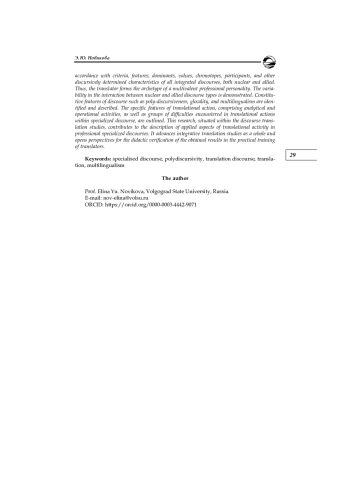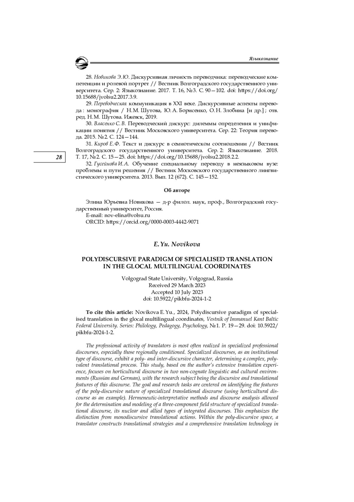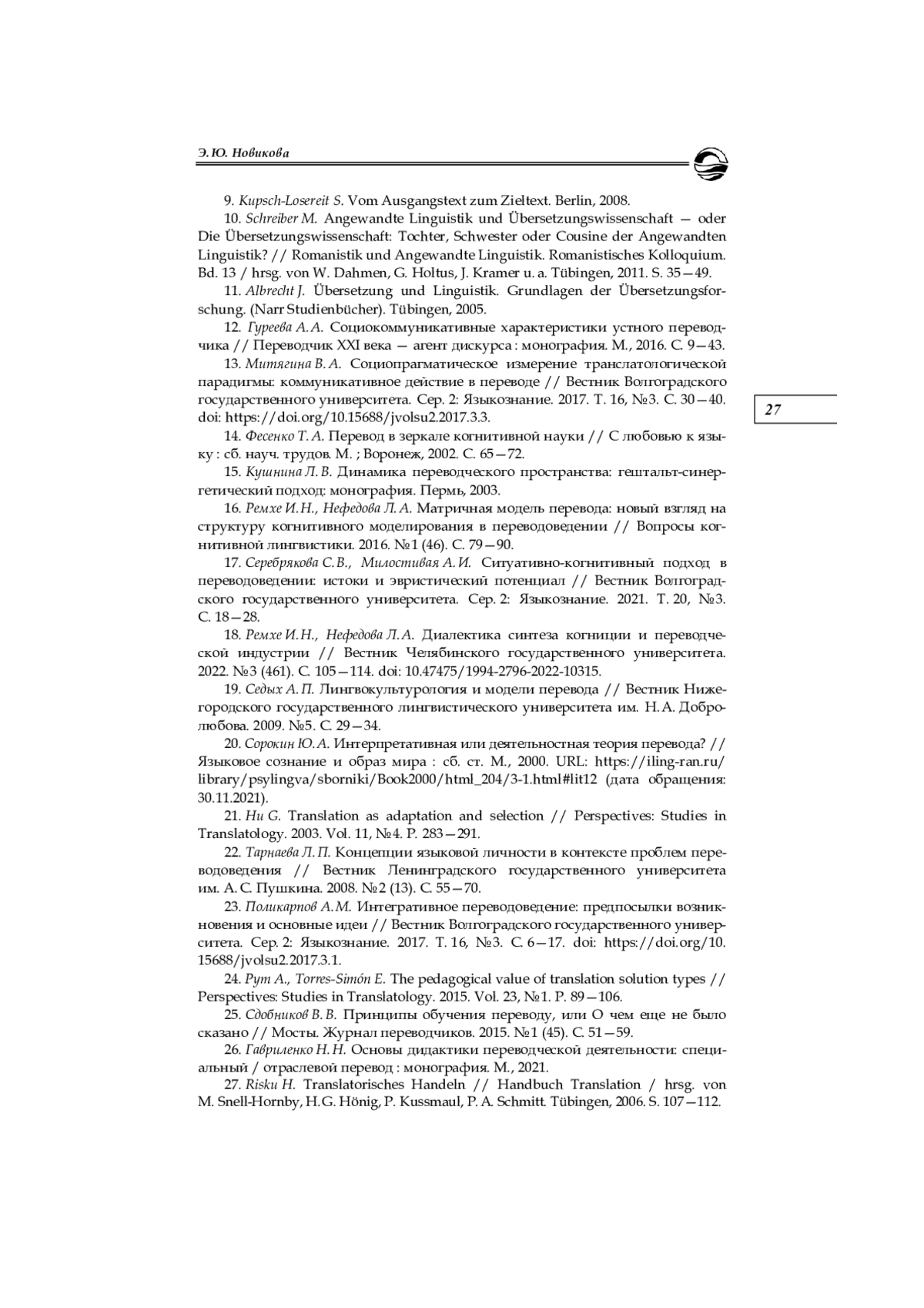 28. Новикова Э. Ю. Дискурсивная личность переводчика: переводческие компетенции и ролевой портрет // Вестник Волгоградского государственного университета. Сер. 2: Языкознание. 2017. Т. 16, № 3. С. 90-102. DOI: 10.15688/jvolsu2.2017.3.9 EDN: ZTSKHP