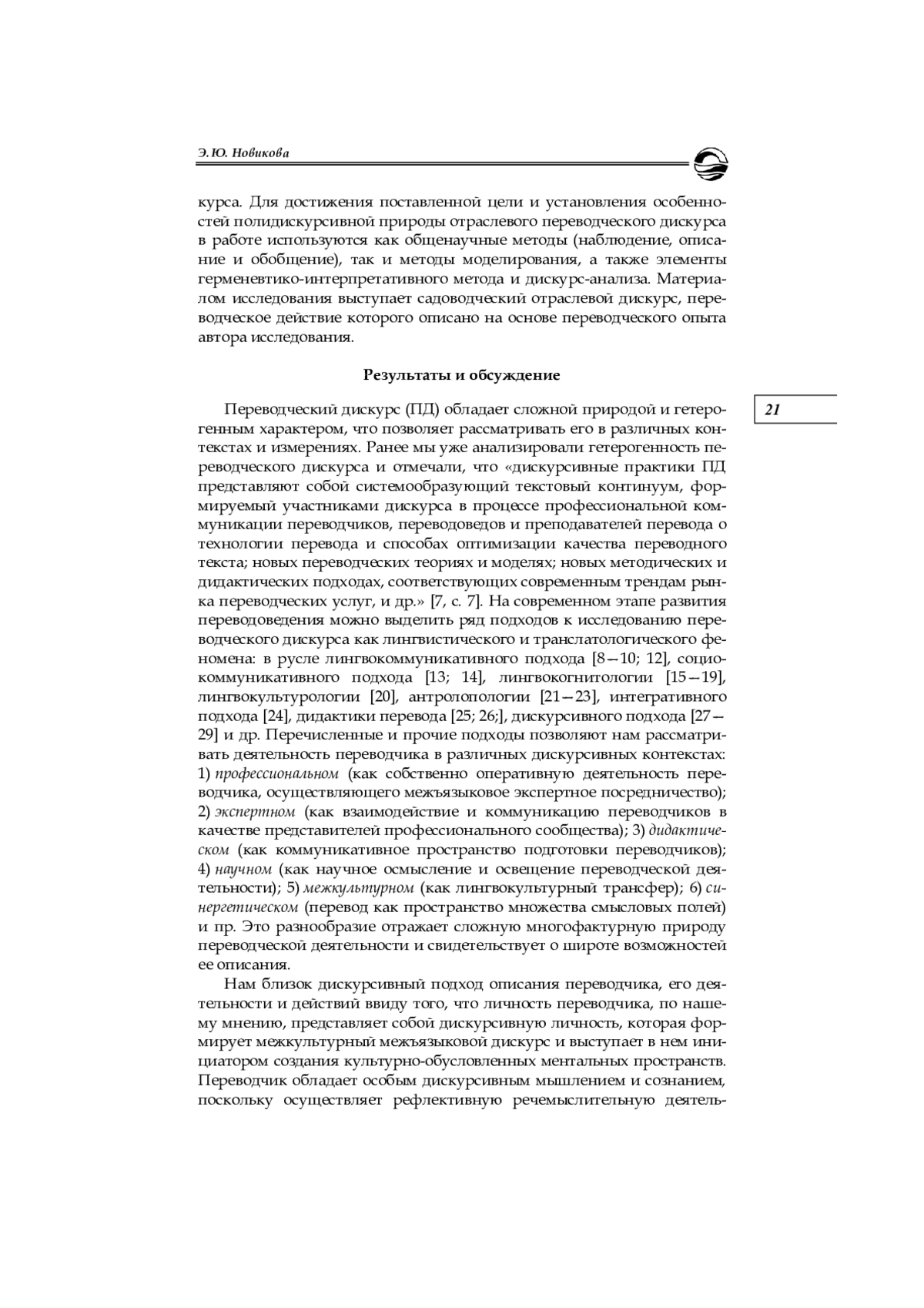 7. Новикова Э. Ю., Наумова А. П. Переводческий дискурс 4.0: разнообразие форматов, жанров и трендов // Вестник Волгоградского государственного университета. Сер. 2: Языкознание. 2021. Т. 20, № 3. С. 5-17. DOI: 10.15688/jvolsu2.2021.3.1 EDN: WSVOHV