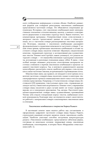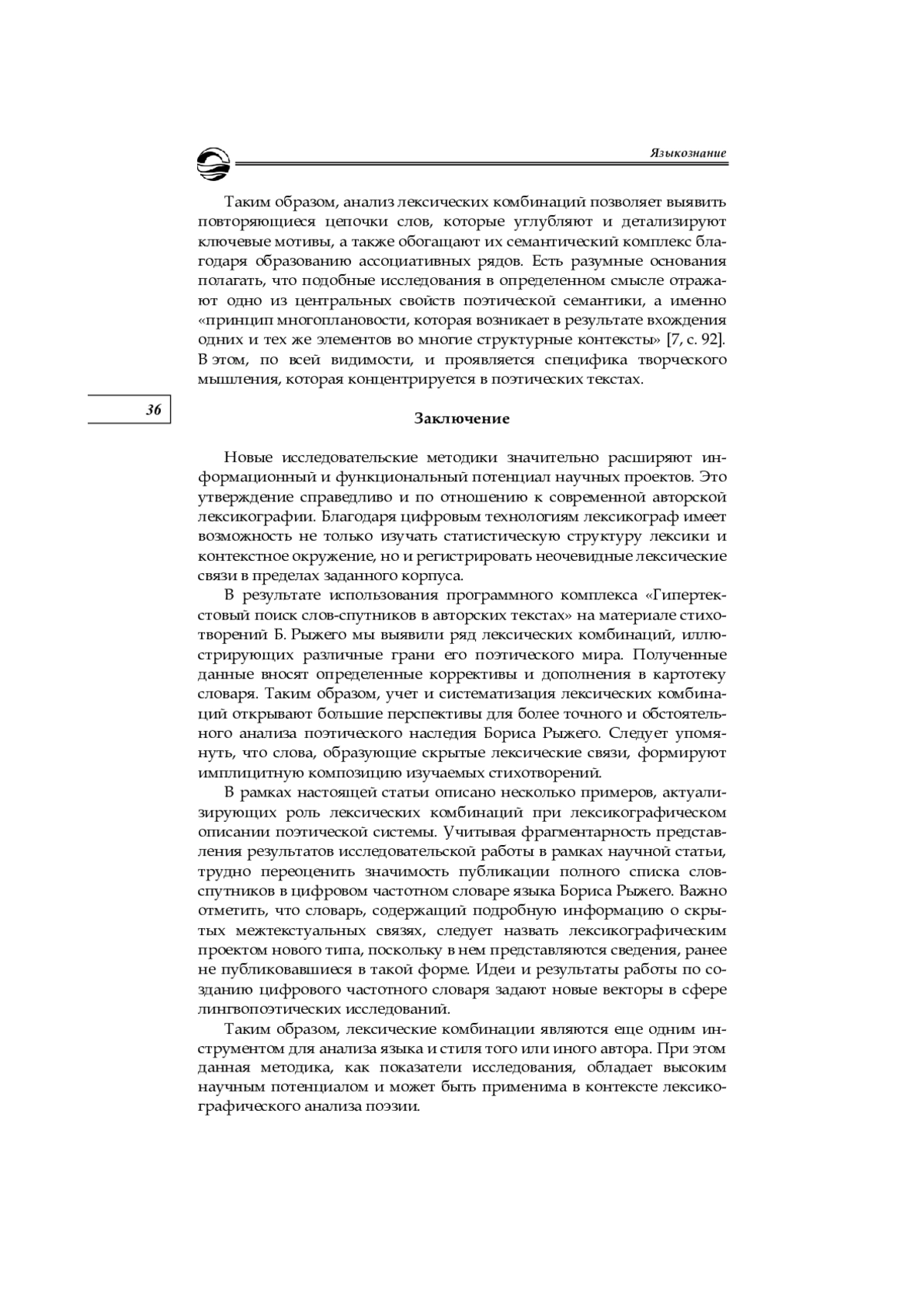 Рассматривается информационный и функциональный потенциал лексических комбинаций в макроструктуре цифрового частотного словаря языка Бориса Рыжего, находящегося на стадии активной разработки. Для выявления лексических комбинаций на материале поэзии Бориса Рыжего использовалась компьютерная программа «Гипертекстовый поиск слов-спутников в авторских текстах». В результате проведенного исследования обнаружены повторяющиеся в разных стихотворениях группы слов, формирующие имплицитную композицию анализируемого поэтического корпуса. В фокусе авторской лексикографии определено прикладное значение лексических комбинаций: полученные сведения о скрытых межтекстовых связях уточняют роль ключевых слов и дополняют картотеку словаря, что открывает широкие перспективы для многоаспектного анализа лексического наследия Бориса Рыжего
