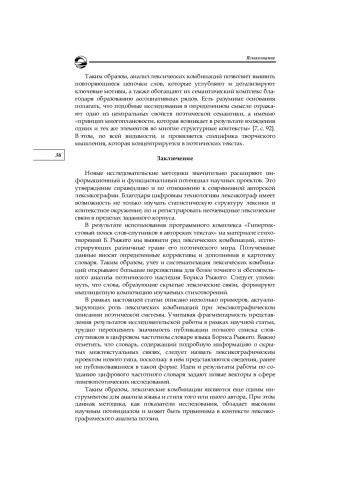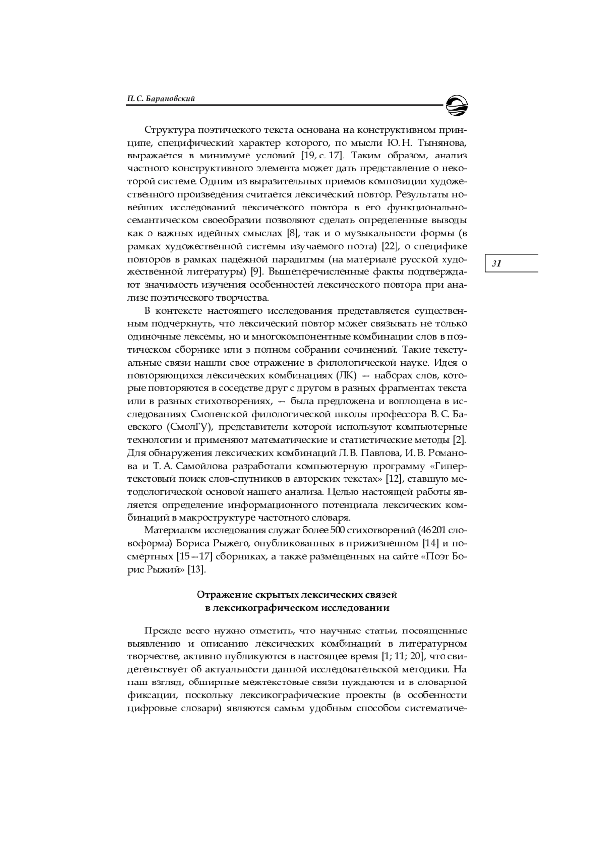 20. Федоскин А. В. Метод выявления лексических комбинаций на примере “древнеримских” стихотворений литературного объединения “Персона” (Смоленск): опыт применения компьютерного исследования // Смоленский филологический сборник. 2021. № 13. С. 114-122. EDN: EUBPOT