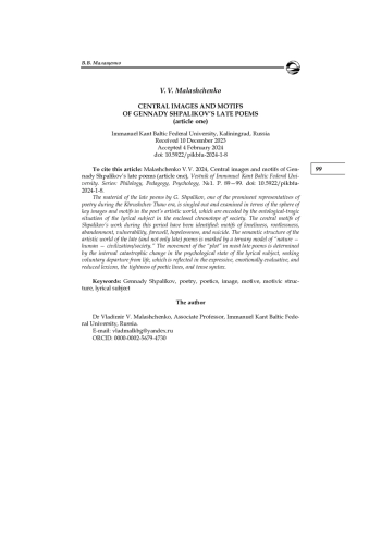 На материале поздних стихотворений Г. Шпаликова, одного из ярких представителей поэзии эпохи хрущевской оттепели, выделяется и рассматривается сфера ключевых образов и мотивов художественного мира поэта, который кодирован ситуацией онтологически-трагической экзистенции лирического субъекта в замкнутом хронотопе общества. Выявлены центральные мотивы творчества Шпаликова этого периода: мотивы одиночества, неприкаянности, заброшенности, беззащитности, прощания, безысходности, самоубийства. Семантику художественного мира поздних (и не только) стихов маркирует тернарная модель «природа — человек — цивилизация / общество». Движением «сюжета» большинства поздних стихотворений определяется внутреннее катастрофическое изменение психического состояния лирического субъекта, стремящегося к добровольному уходу из жизни, что закреплено в экспрессивной, эмоционально-оценочной и сниженной лексике, тесноте стихотворного ряда и напряженном синтаксисе