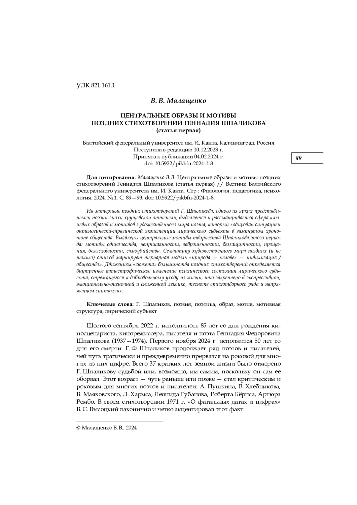 6. Геронимус В. “А человек уходит в ночь.”.. О поэзии Геннадия Шпаликова // Pechorin.net. URL: https://pechorin.net/articles/view/a-chieloviek-ukhodit-v-noch-o-poezii-giennadiia-shpalikova (дата обращения: 24.11.2023).