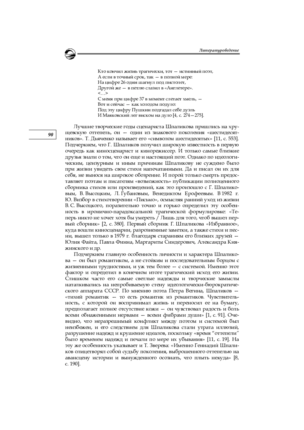 8. Зверева Т. В. “Куда ж нам плыть?”: Пушкинские ориентиры в творчестве Геннадия Шпаликова // Уральский филологический вестник. 2021. № 4. С. 179-193.
