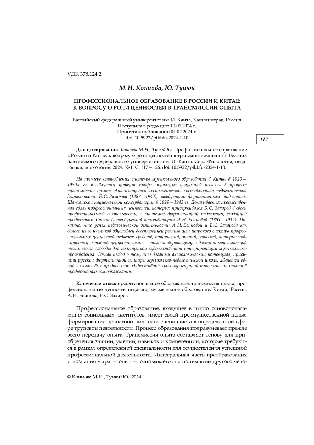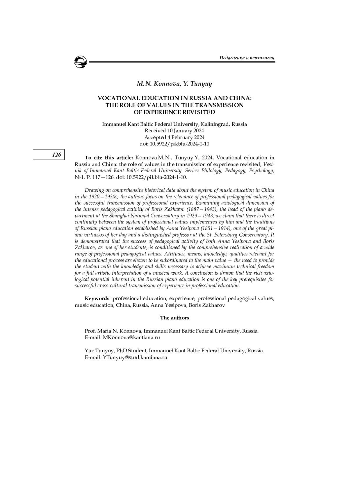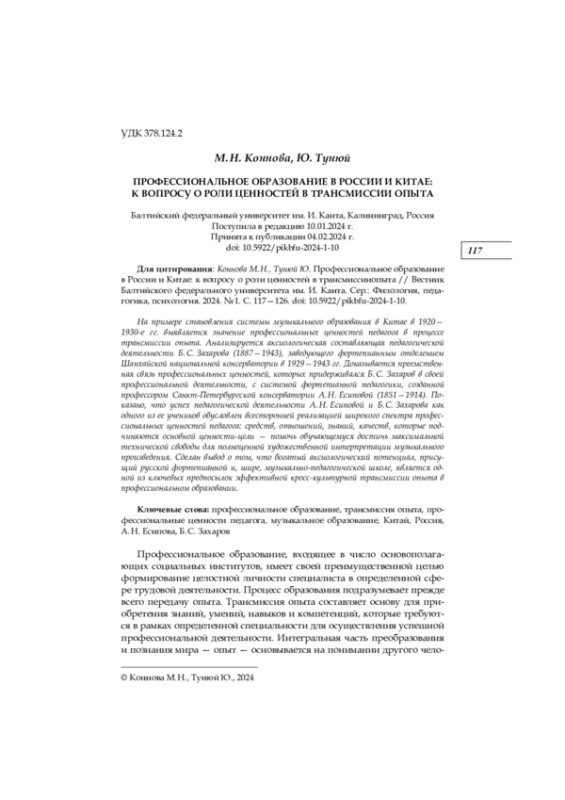 На примере становления системы музыкального образования в Китае в 1920— 1930-е гг. выявляется значение профессиональных ценностей педагога в процессе трансмиссии опыта. Анализируется аксиологическая составляющая педагогической деятельности Б. С. Захарова (1887—1943), заведующего фортепианным отделением Шанхайской национальной консерватории в 1929—1943 гг. Доказывается преемственная связь профессиональных ценностей, которых придерживался Б. С. Захаров в своей профессиональной деятельности, с системой фортепианной педагогики, созданной профессором Санкт-Петербургской консерватории А. Н. Есиповой (1851—1914). Показано, что успех педагогической деятельности А. Н. Есиповой и Б. С. Захарова как одного из ее учеников обусловлен всесторонней реализацией широкого спектра профессиональных ценностей педагога: средств, отношений, знаний, качеств, которые подчиняются основной ценности-цели — помочь обучающемуся достичь максимальной технической свободы для полноценной художественной интерпретации музыкального произведения. Сделан вывод о том, что богатый аксиологический потенциал, присущий русской фортепианной и, шире, музыкально-педагогической школе, является одной из ключевых предпосылок эффективной кросс-культурной трансмиссии опыта в профессиональном образовании