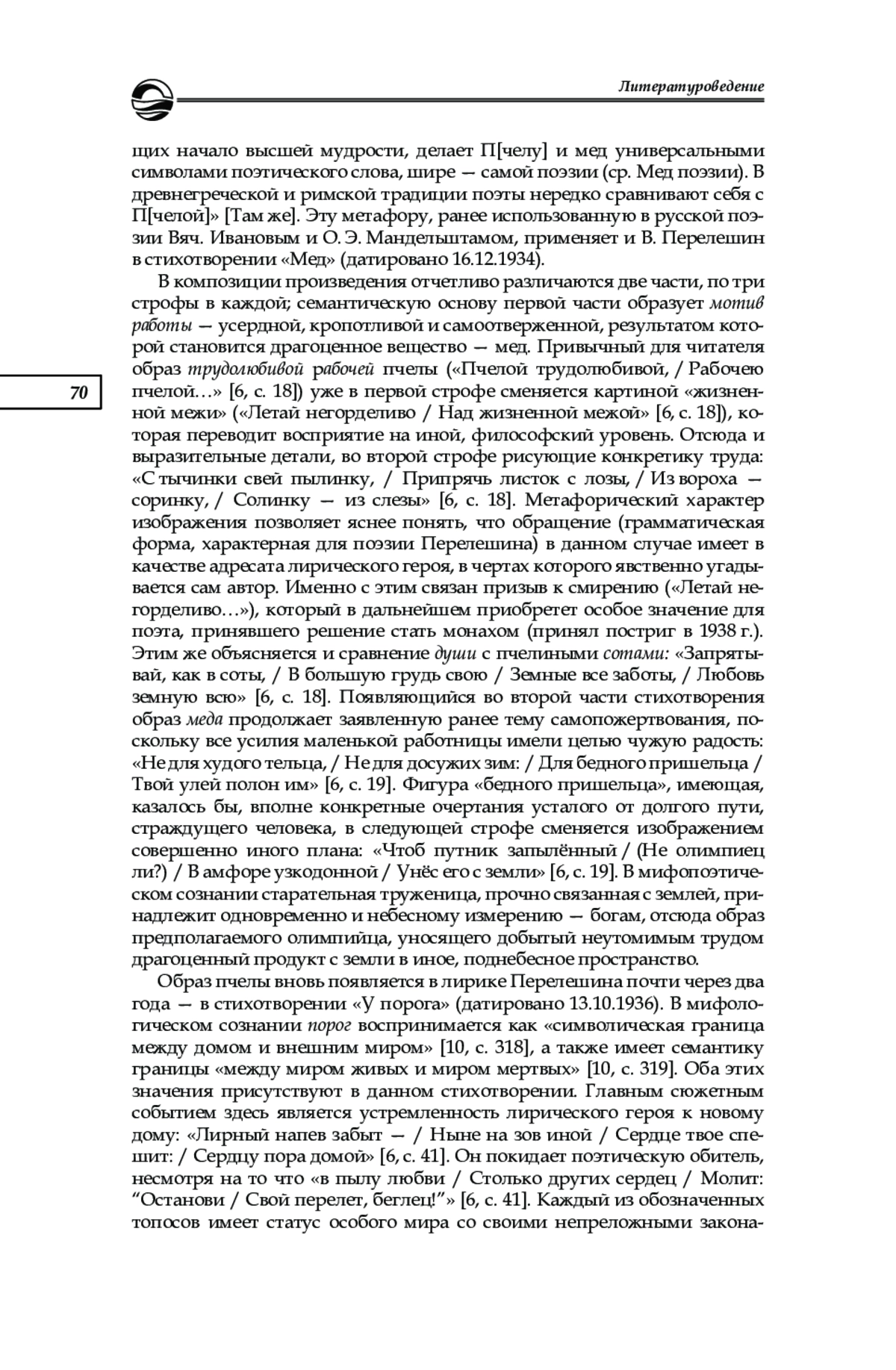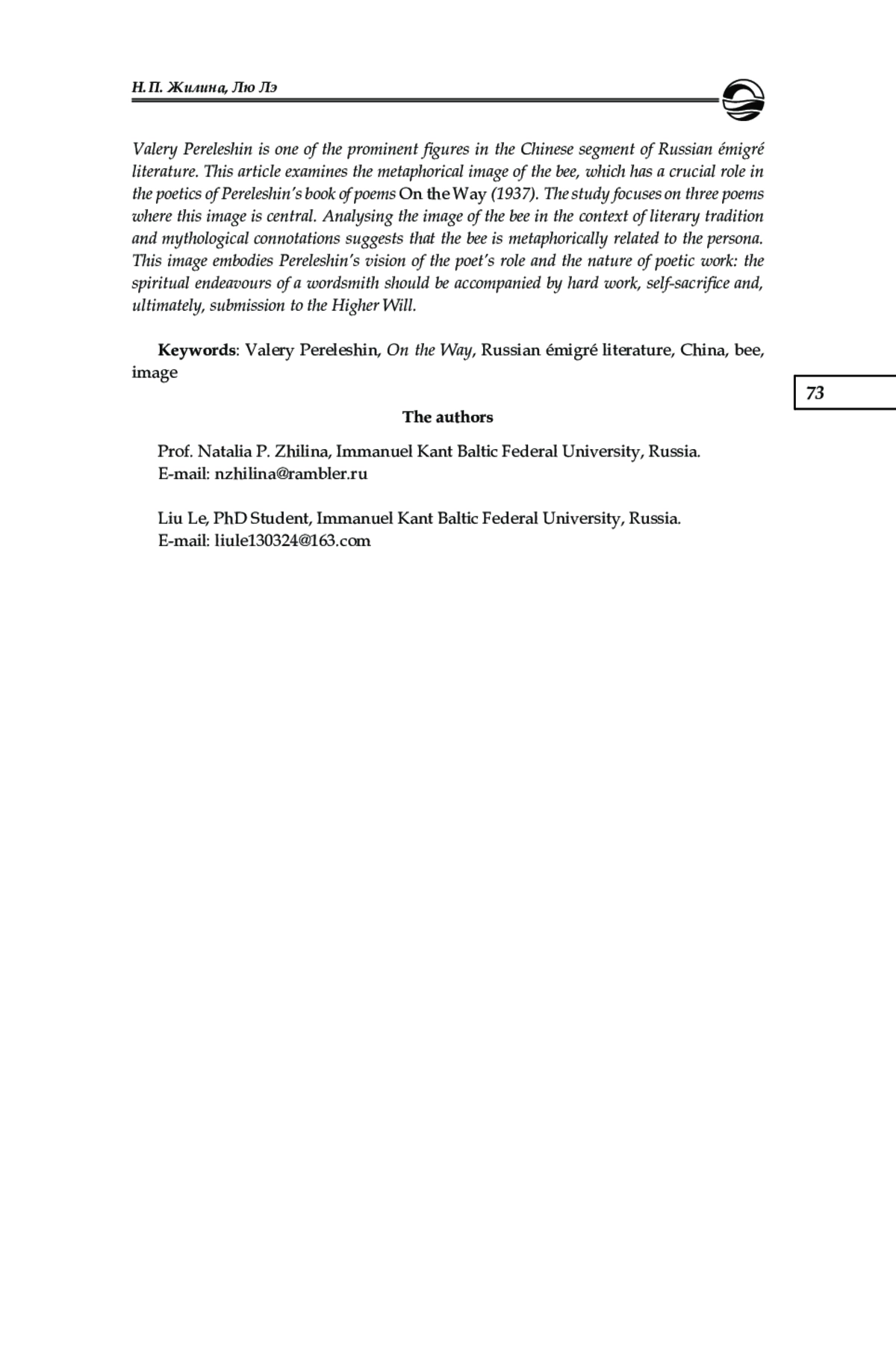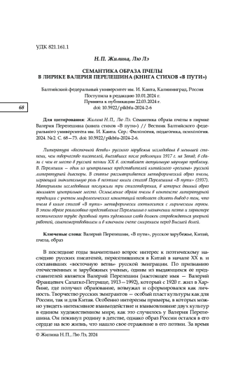 Литература «восточной ветви» русского зарубежья исследована в меньшей степени, чем творчество писателей, выехавших после революции 1917 г. на Запад, в связи с чем ее место в русской поэзии ХХ в. составляет актуальную научную проблему. В. Перелешин — один из центральных представителей китайского «региона» русской литературной диаспоры. В статье рассматривается метафорический образ пчелы, играющий значительную роль в поэтике книги стихов Перелешина «В пути» (1937). Материалом исследования послужили три стихотворения, в которых данный образ занимает центральное место. Осмысление образа пчелы в контексте литературной традиции с учетом мифологических коннотаций позволяет сделать вывод о том, что пчела в книге стихов «В пути» метафорически соотносится с лирическим героем. В этом образе реализовано представление Перелешина о назначении поэта и характере поэтического труда: духовный путь художника слова должен сопровождаться упорной работой, самопожертвованием и в конечном счете смирением перед Высшей волей.