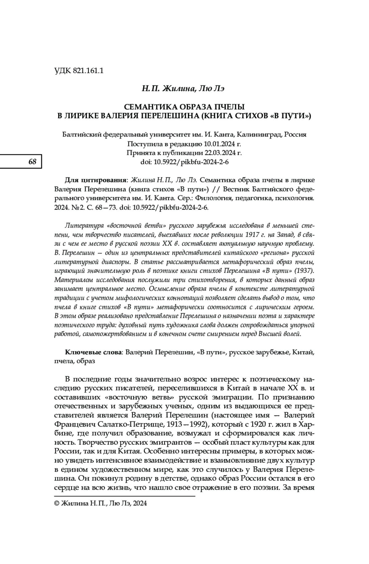3. Ван Линлин, Лю Лэ. Основные темы поэзии Валерия Перелешина // Мир науки, культуры, образования. 2021. № 3 (88). С. 407-408.