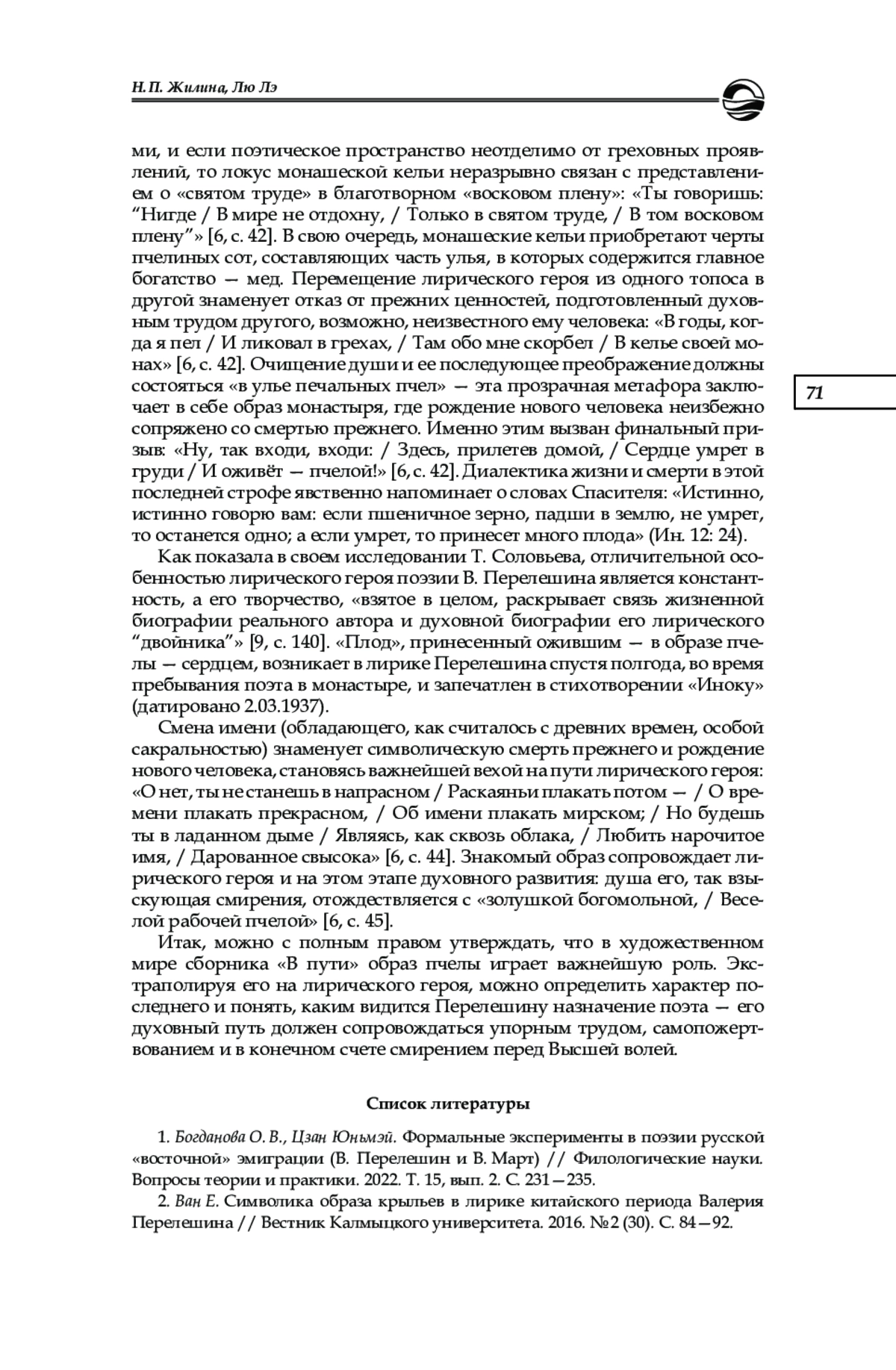 2. Ван Е. Символика образа крыльев в лирике китайского периода Валерия Перелешина // Вестник Калмыцкого университета. 2016. № 2 (30). С. 84-92.