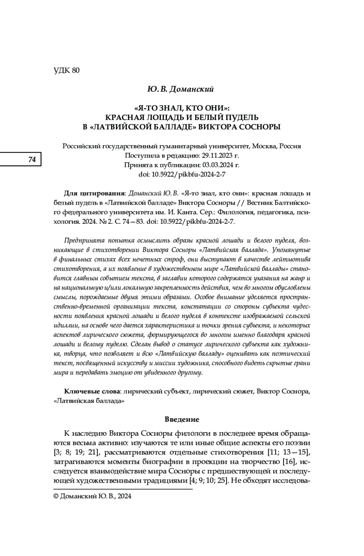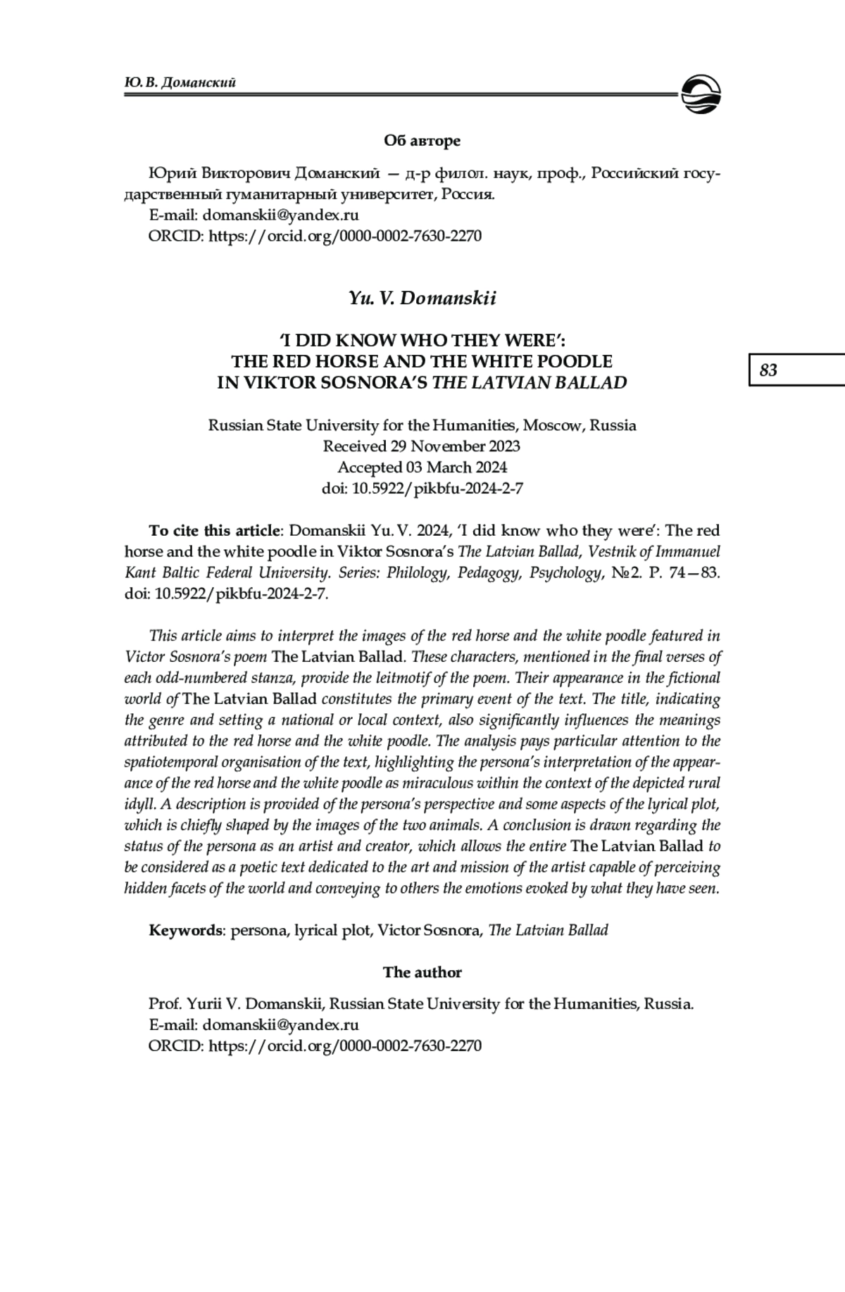Предпринята попытка осмыслить образы красной лошади и белого пуделя, возникающие в стихотворении Виктора Сосноры «Латвийская баллада». Упомянутые в финальных стихах всех нечетных строф, они выступают в качестве лейтмотива стихотворения, а их появление в художественном мире «Латвийской баллады» становится главным событием текста, в заглавии которого содержатся указания на жанр и на национальную и/или локальную закрепленность действия, чем во многом обусловлены смыслы, порождаемые двумя этими образами. Особое внимание уделяется пространственно-временной организации текста, констатации со стороны субъекта чудесности появления красной лошади и белого пуделя в контексте изображаемой сельской идиллии, на основе чего дается характеристика и точки зрения субъекта, и некоторых аспектов лирического сюжета, формирующегося во многом именно благодаря красной лошади и белому пуделю. Сделан вывод о статусе лирического субъекта как художника, творца, что позволяет и всю «Латвийскую балладу» оценивать как поэтический текст, посвященный искусству и миссии художника, способного видеть скрытые грани мира и передавать эмоцию от увиденного другому