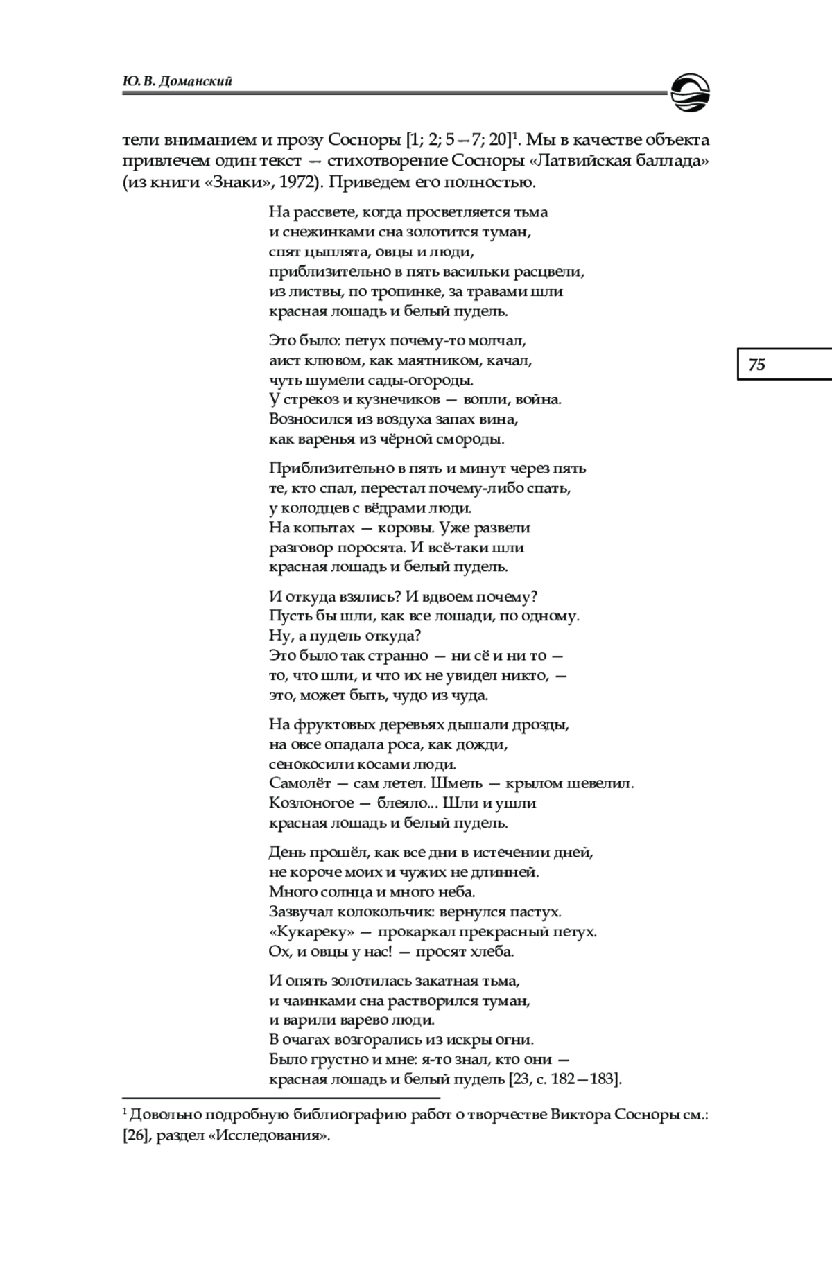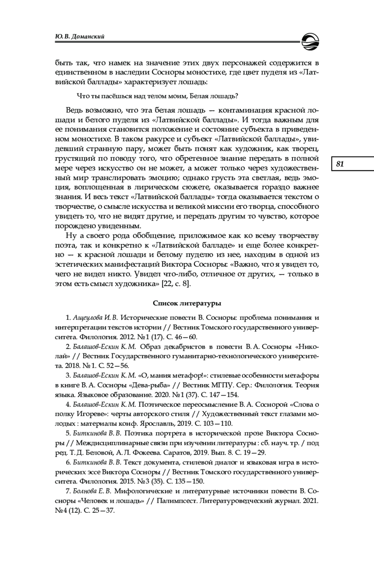 7. Болнова Е. В. Мифологические и литературные источники повести В. Сосноры “Человек и лошадь” // Палимпсест. Литературоведческий журнал. 2021. № 4 (12). С. 25-37. EDN: CTBUOK