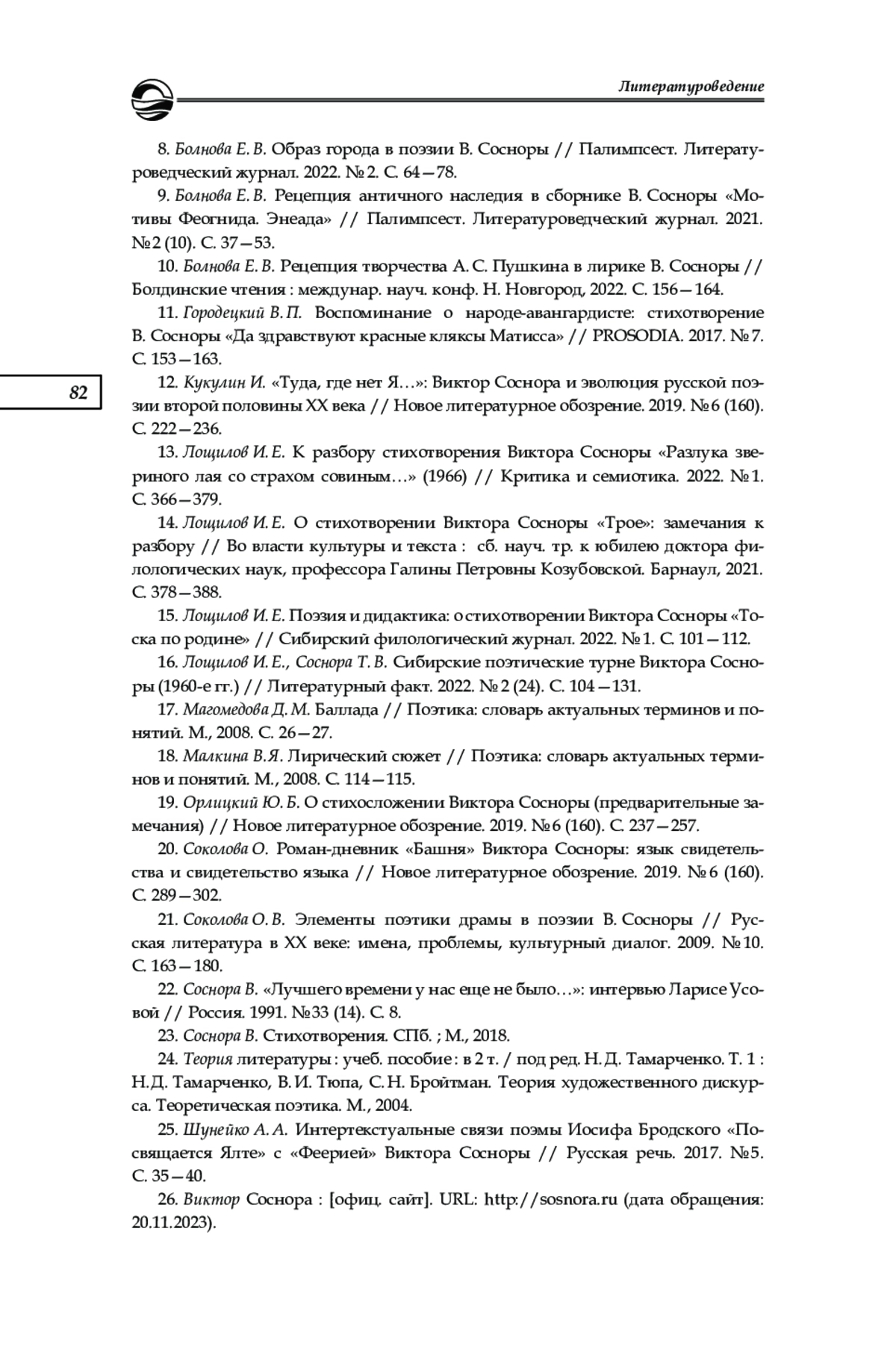 8. Болнова Е. В. Образ города в поэзии В. Сосноры // Палимпсест. Литературоведческий журнал. 2022. № 2. С. 64-78. EDN: LPUZFL