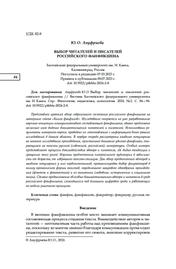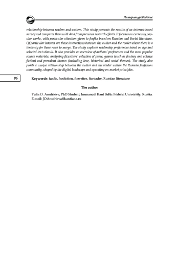 Представлен краткий обзор современного состояния российского фанфикшена на материале сайта «Книга фанфиков». Исследование опирается на уже разработанные научные концепции коммуникативной составляющей фанфикшена, однако предложено несколько иное видение взаимоотношений читателей и писателей. Использованы результаты интернет-опроса, проведено их сопоставление с информацией более ранних исследований в данной области. В первую очередь рассмотрены наиболее популярные на момент исследования произведения, пристальное внимание уделено фанфикам, опирающимся на тексты русской (советской, российской) литературы. Особый интерес представляют процессы взаимодействия автора и читателя, где видна тенденция к сращению этих ролей. Изучены предпочтения читательской аудитории в зависимости от возраста, от избранного текста-стимула. Дан обзор предпочтений авторов и наиболее популярных у них первоисточников, проанализирован выбор фикрайтеров в пользу прозаической формы текстов, определенного жанрового своеобразия произведений (фэнтези и фантастика) и их тематики (любовные, исторические и социальные темы). Сделано предположение об особых взаимоотношениях автора и читателя в среде российского фанфикшена, сложившихся под влиянием цифровой среды и работающих по модели рыночного принципа