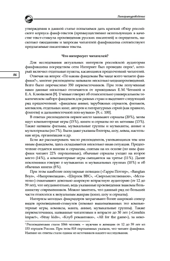 9. Четина Е. М., Клюйкова Е. А. Фандомы и фанфики: креативные практики на виртуальных платформах // Вестник Пермского университета. Российская и зарубежная филология. 2015. № 3 (31). С. 95-104. EDN: UJXKAR