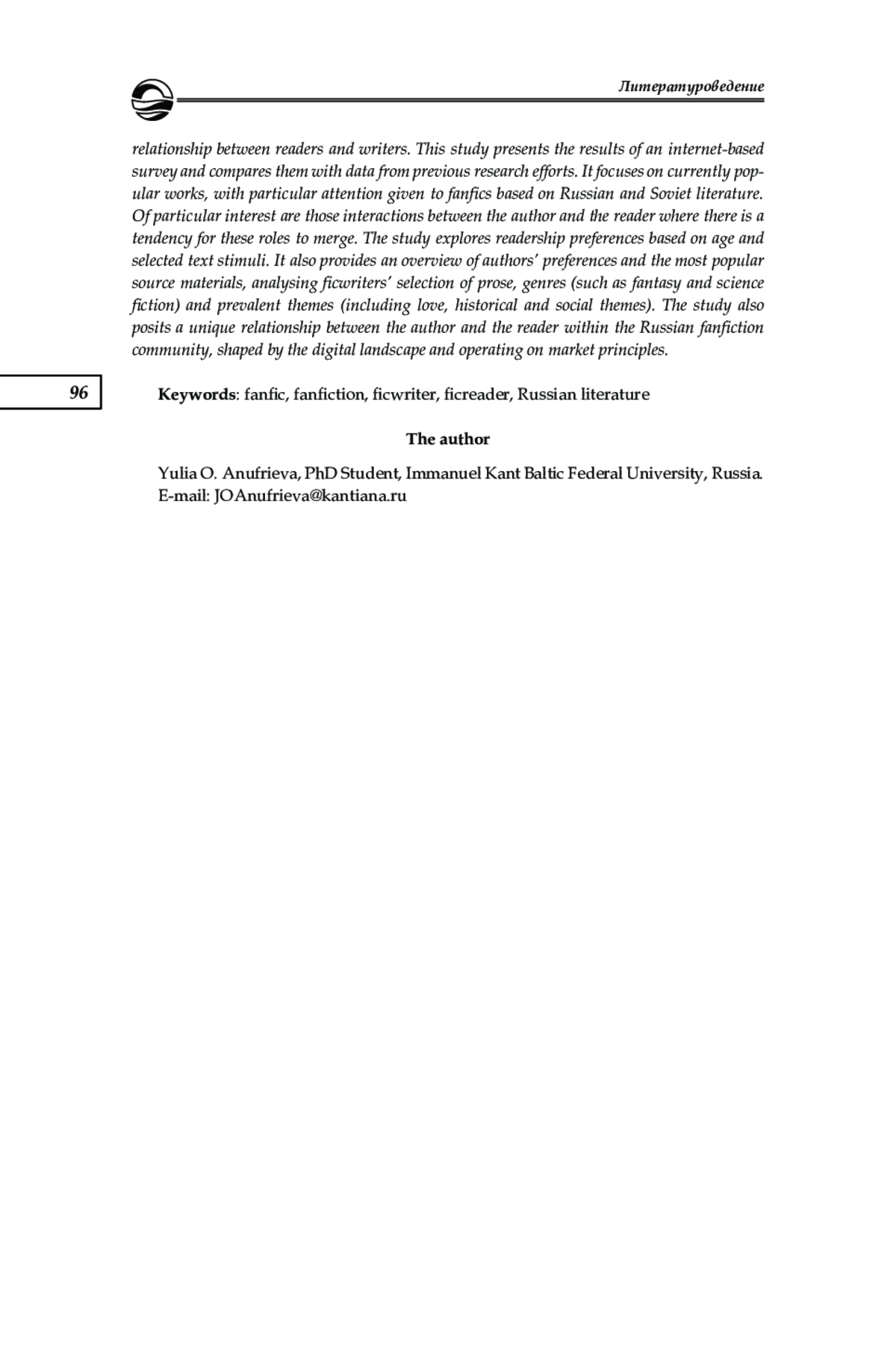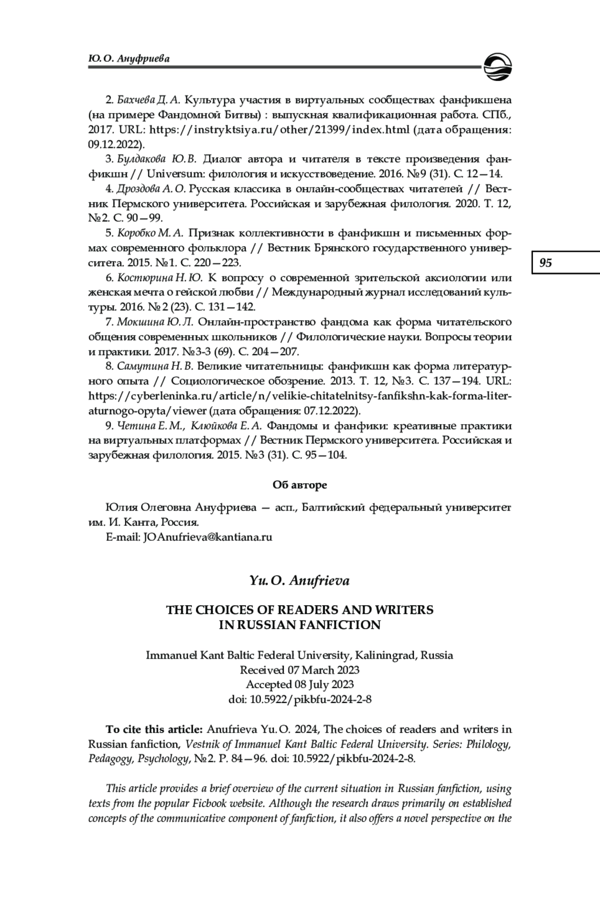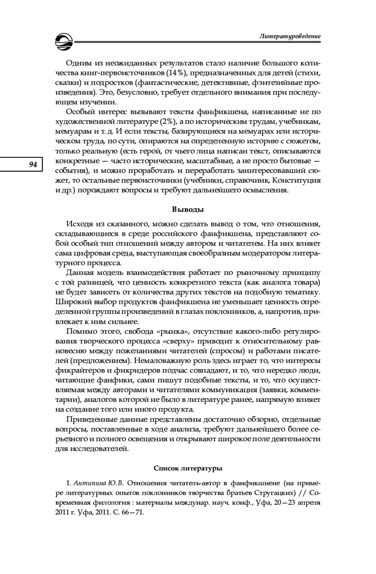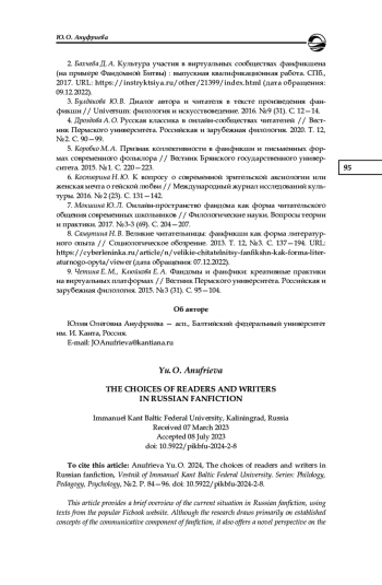 1. Антипина Ю. В. Отношения читатель-автор в фанфикшнене (на примере литературных опытов поклонников творчества братьев Стругацких) // Современная филология: материалы междунар. науч. конф., Уфа, 20-23 апреля 2011 г. Уфа, 2011. С. 66-71. EDN: VJYUBT