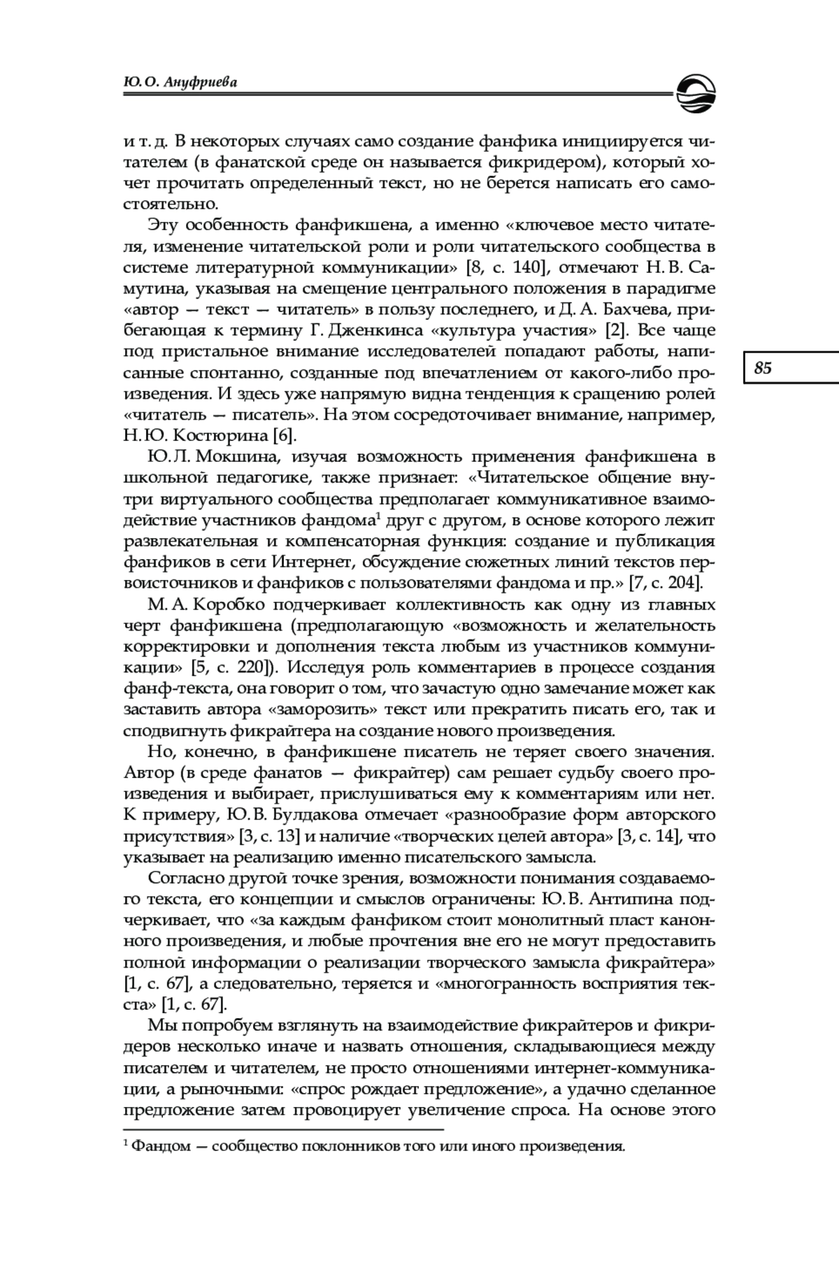 7. Мокшина Ю. Л. Онлайн-пространство фандома как форма читательского общения современных школьников // Филологические науки. Вопросы теории и практики. 2017. № 3-3 (69). С. 204-207. EDN: VVVRKN