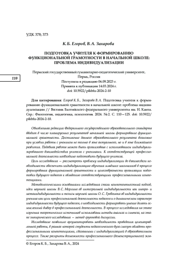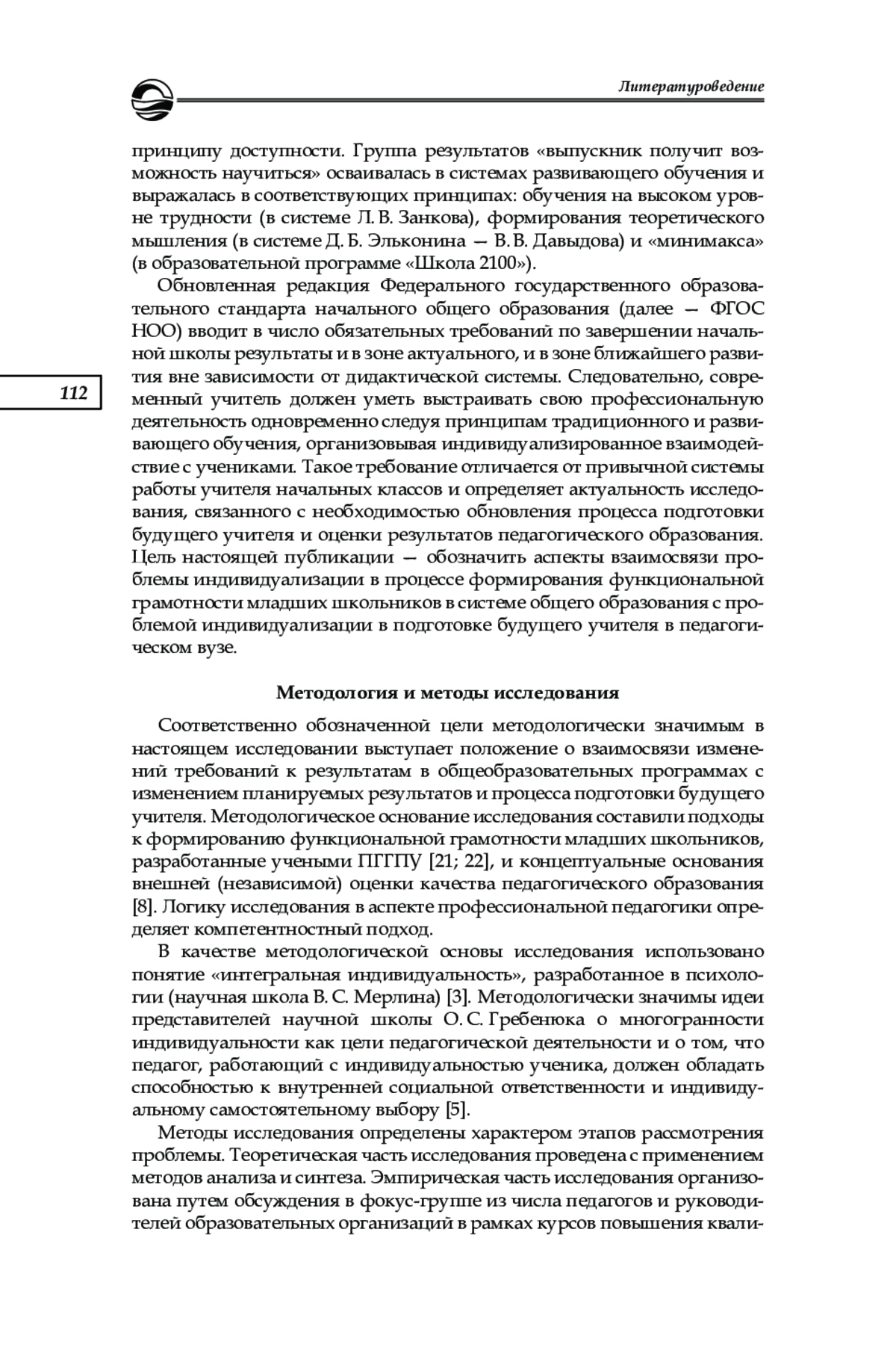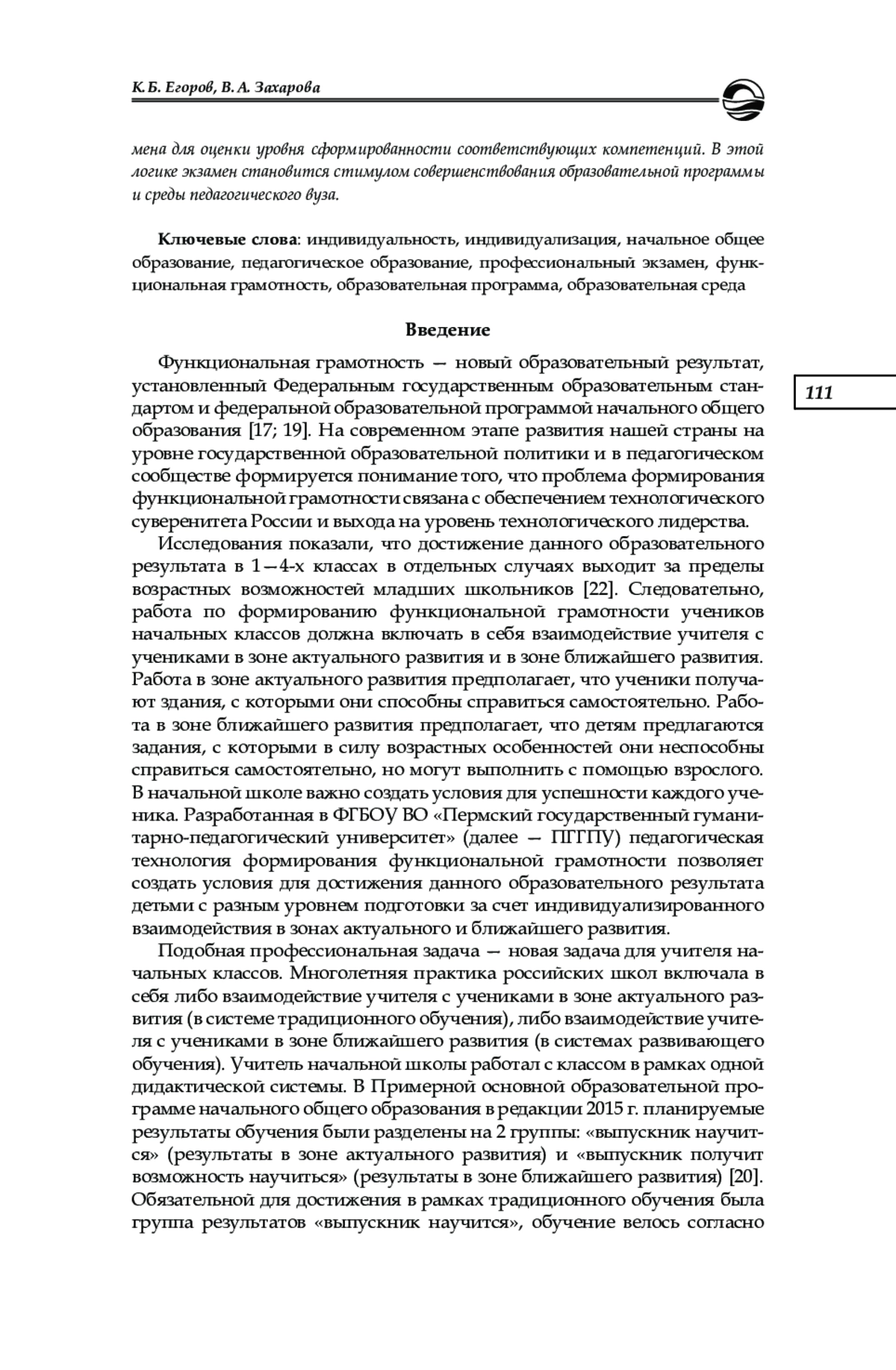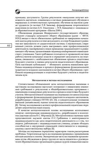 Обновленная редакция Федерального государственного образовательного стандарта вводит в число планируемых результатов начальной школы формирование функциональной грамотности. Достижение данного образовательного результата возможно при условии работы с учеником не только в зоне актуального, но и в зоне ближайшего развития. Подобная работа может быть организована с использованием индивидуализированного взаимодействия учителя с учениками. К соответствующей профессиональной деятельности необходимо подготовить будущего учителя. Цель исследования — рассмотреть проблему индивидуализации во взаимосвязи необходимости обеспечить индивидуализацию обучения младших школьников в процессе формирования функциональной грамотности и целесообразности организации подготовки будущего педагога к овладению соответствующими профессиональными компетенциями. Методологическими основаниями исследования стали компетентностный подход, идеи научной школы В. С. Мерлина об интегральной индивидуальности как интра- и метаиндивидуальности и тезисы научной школы О. С. Гребенюка об индивидуальности ученика как цели профессиональной деятельности педагога и о динамическом характере индивидуальности будущего педагога, о необходимости формировать умение делать осмысленный выбор в профессиональной деятельности. В процессе исследования на этапе изучения теоретических источников использованы методы анализа и синтеза, на этапе эмпирического исследования — метод групповой дискуссии. Исследование позволило аргументировать необходимость проведения целенаправленной работы, в рамках которой студенты педагогического вуза смогут овладеть профессиональными компетенциями, связанными с индивидуализацией в образовательном процессе. Также раскрыты возможности профессионального (демонстрационного) экзамена для оценки уровня сформированности соответствующих компетенций. В этой логике экзамен становится стимулом совершенствования образовательной программы и среды педагогического вуза