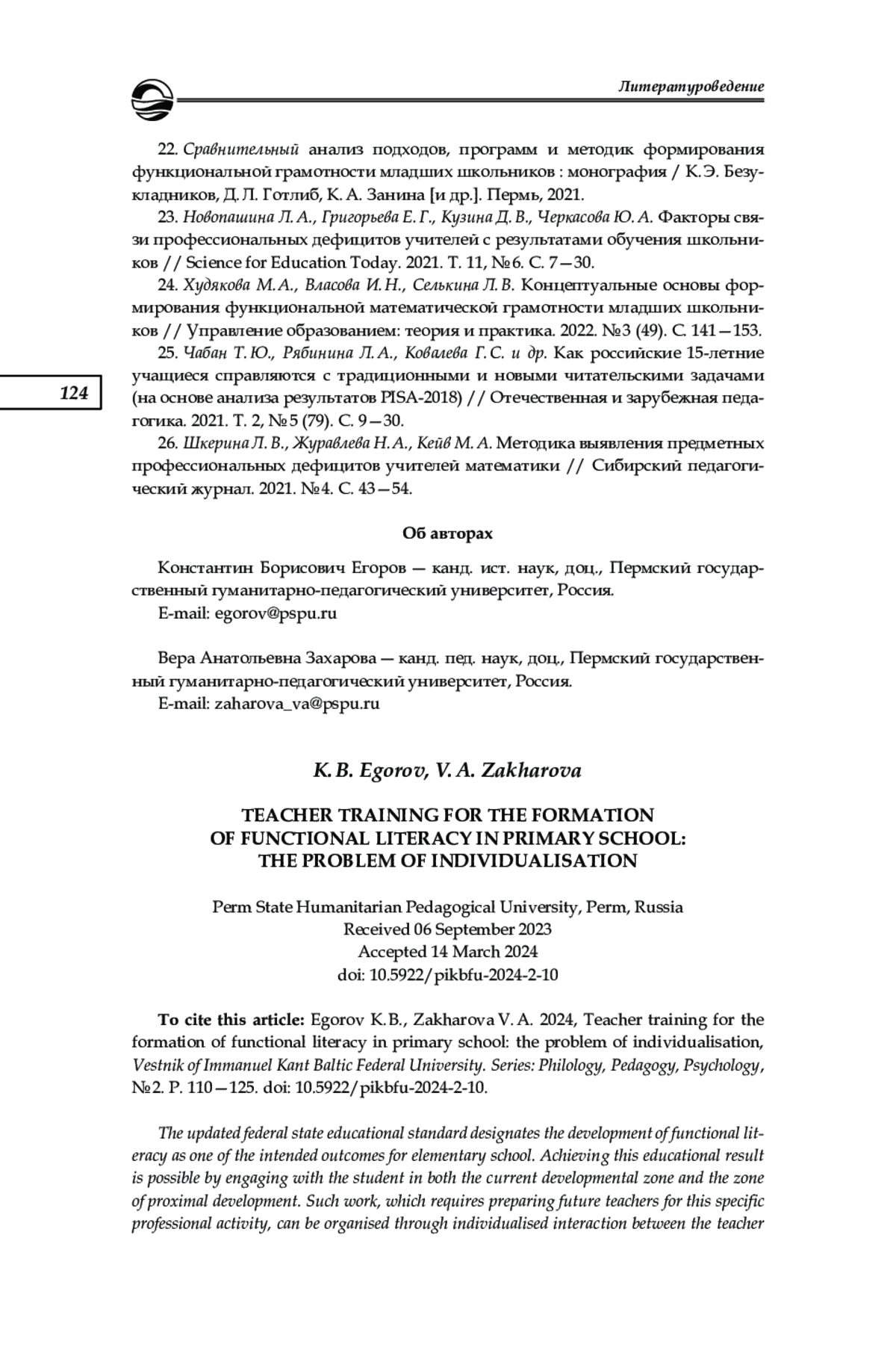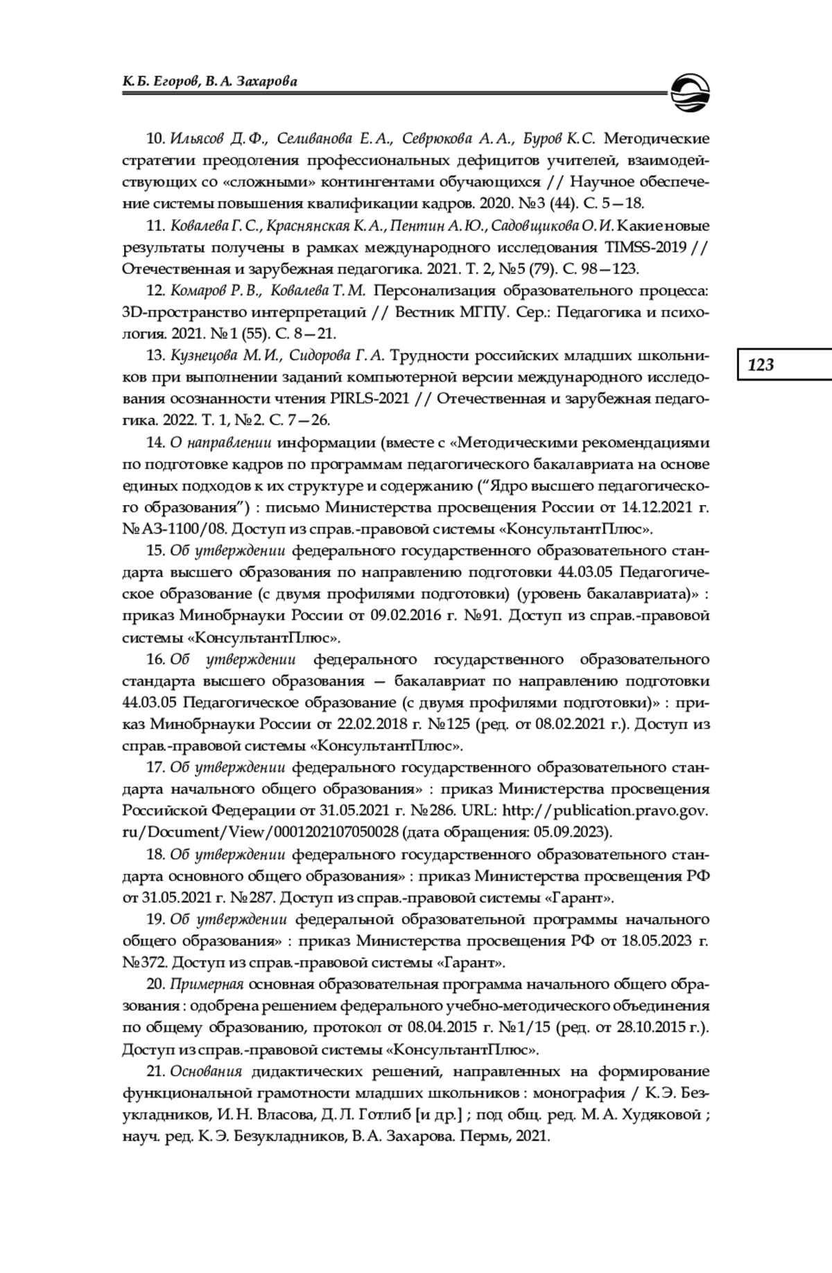 21. Основания дидактических решений, направленных на формирование функциональной грамотности младших школьников: монография / К. Э. Безукладников, И. Н. Власова, Д. Л. Готлиб [и др.]; под общ. ред. М. А. Худяковой; науч. ред. К. Э. Безукладников, В. А. Захарова. Пермь, 2021. EDN: OXIWHS
