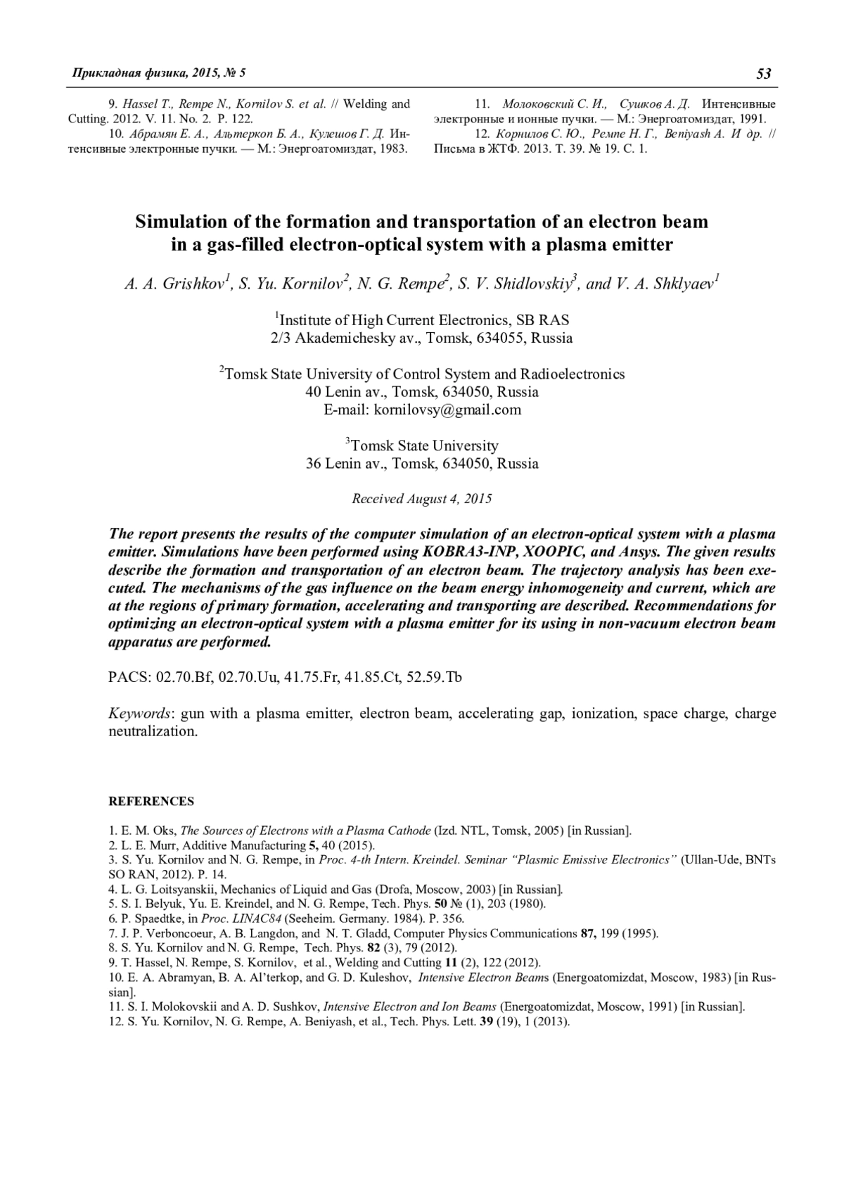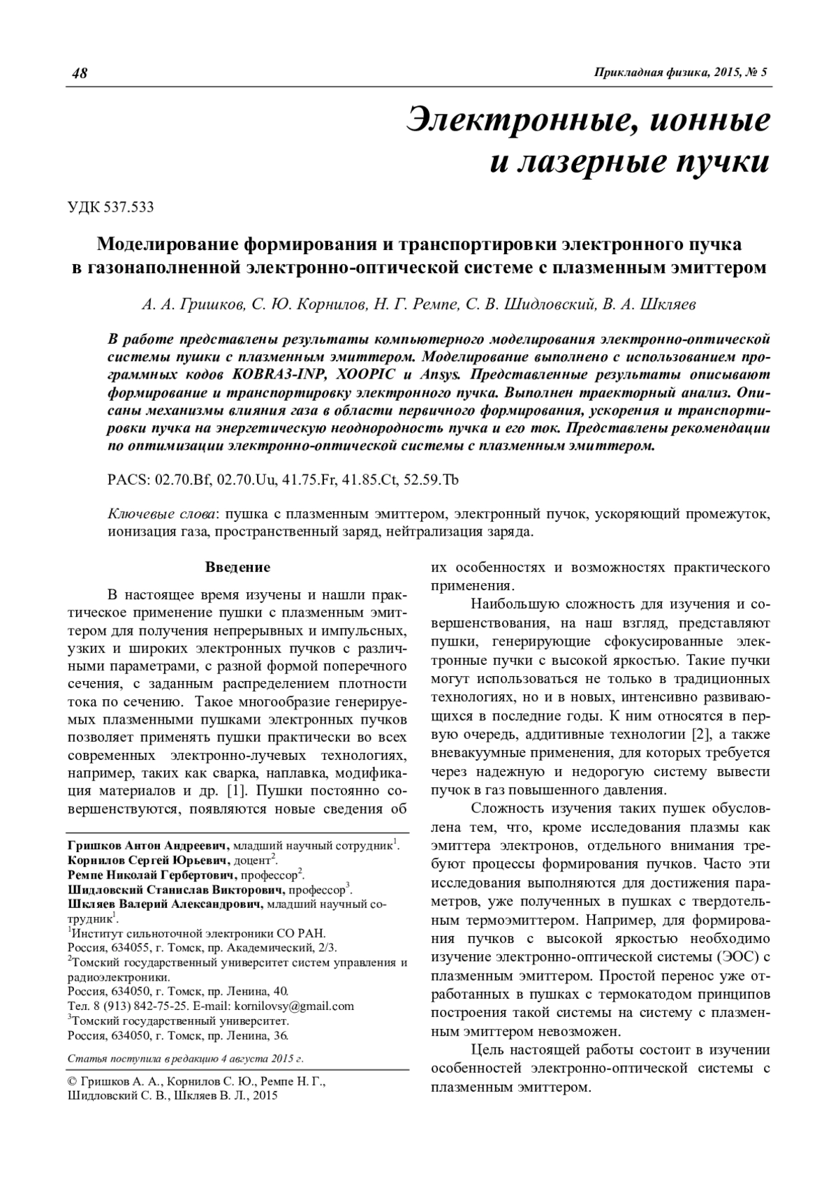 А. А. Grishkov, S. Yu. Kornilov, N. G. Rempe, S. V. Shidlovskiy, and V. A. Shklyaev Simulation of the formation and transportation of an electron beam in a gas-filled electron-optical system with a plasma emitter 48