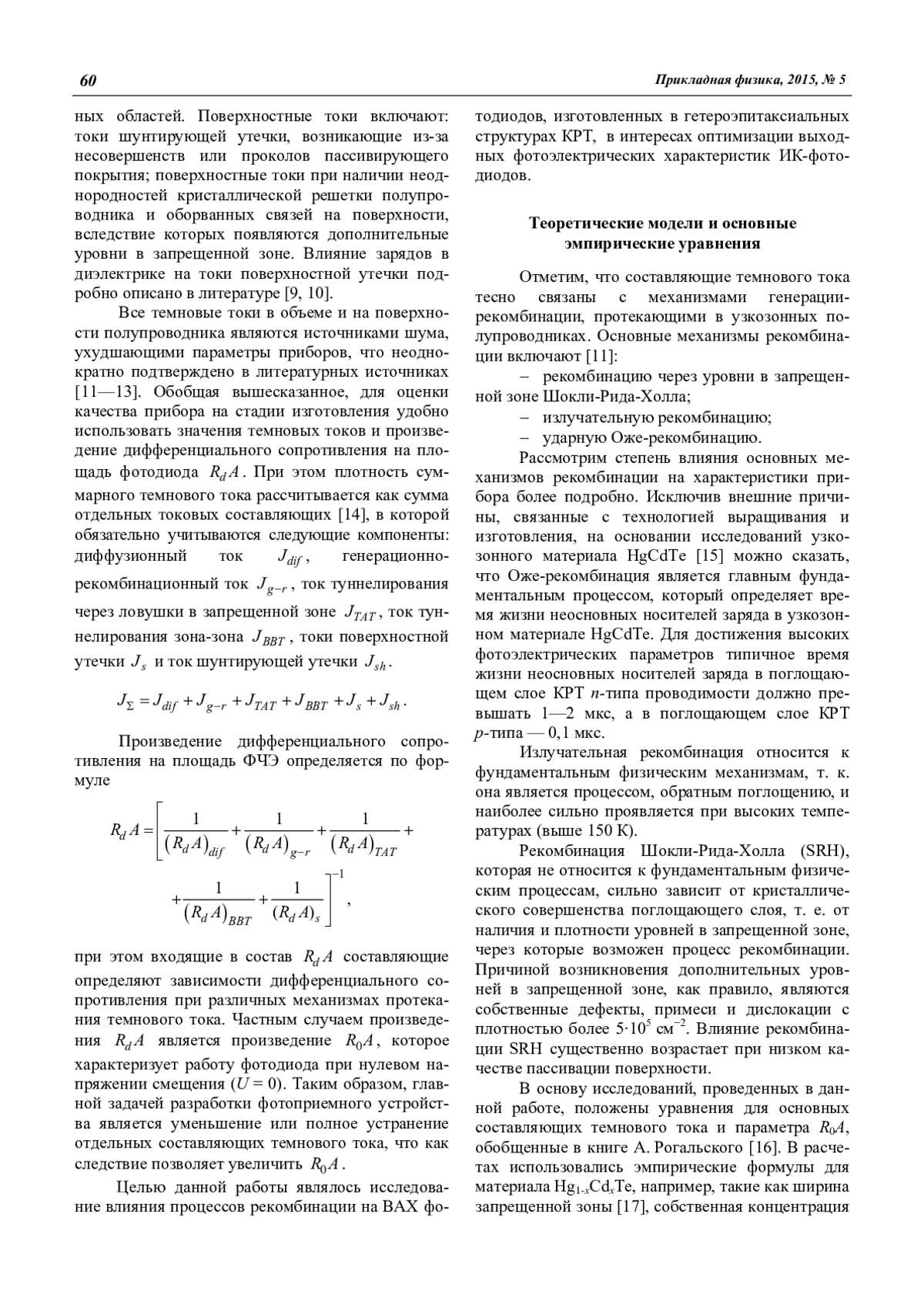 Рассмотрено влияние процессов рекомбинации на вольт-амперные характеристики фотодиодов, изготовленных в узкозонных полупроводниковых материалах. Приведены основные эмпирические зависимости для темновых токов и произведения R0A для фотодиодов на основе тройных соединений кадмий-ртуть-теллур.