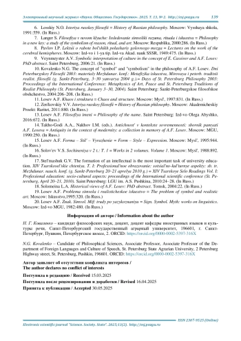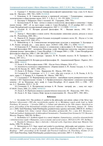 9. Вейнмейстер А. В. Символическая интерпретация культуры в концепции Э. Кассирера и А. Ф. Лосева: автореф. дис. … канд. филос. наук: 24.00.01. СПб., 2006. 21 с. EDN: NKEJJT