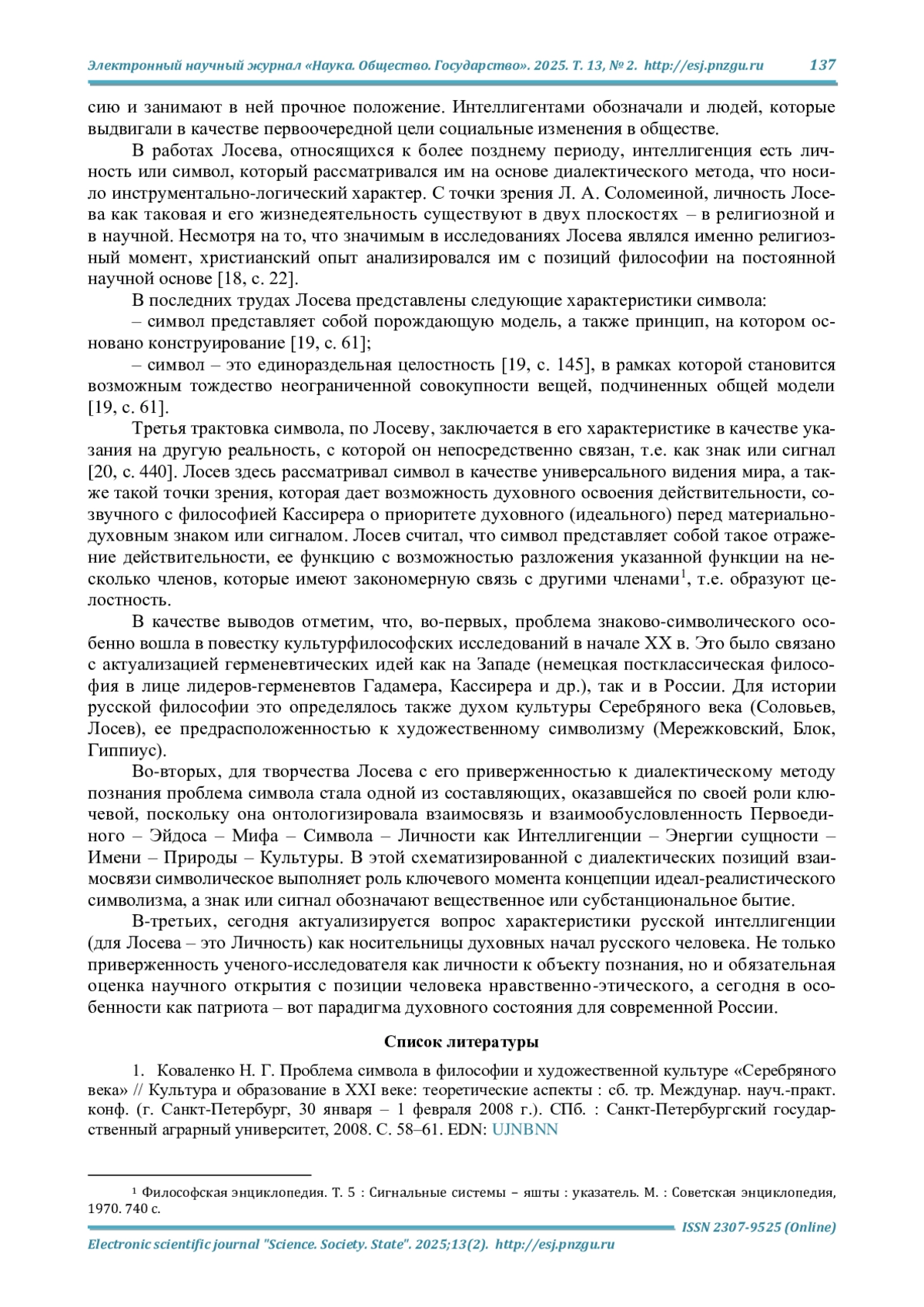 18. Соломеина Л. А. Исторические взгляды А. Ф. Лосева: автореф. дис.. канд. ист. наук: 07.00.09. Томск, 2004. 22 с. EDN: NHMZTD