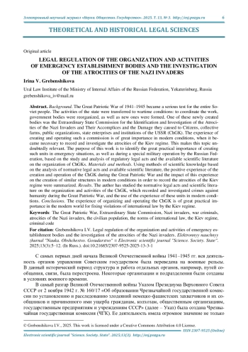 Актуальность и цели. Великая Отечественная война 1941-1945 гг. стала серьезным испытанием для всего советского народа. Деятельность государства была перестроена в соответствии с условиями военного времени: для координации работы органы государственного управления реорганизовывались, а также образовывались новые. Одним из таких вновь созданных органов стала Чрезвычайная государственная комиссия по установлению и расследованию злодеяний немецко-фашистских захватчиков и их сообщников и причиненного ими ущерба гражданам, колхозам, общественным организациям, государственным предприятиям и учреждениям СССР. Опыт создания и деятельности подобной комиссии имеет огромное значение в современных условиях, когда возникла необходимость фиксации и расследования злодеяний киевского режима. Сказанное обусловливает несомненную актуальность данной темы. Цель настоящей работы - на основе изучения и анализа нормативных правовых актов и имеющейся научной литературы, посвященной организации Чрезвычайной государственной комиссии, обозначить большую практическую значимость создания подобных подразделений в чрезвычайных условиях, а также в период проведения Российской Федерацией специальной военной операции.