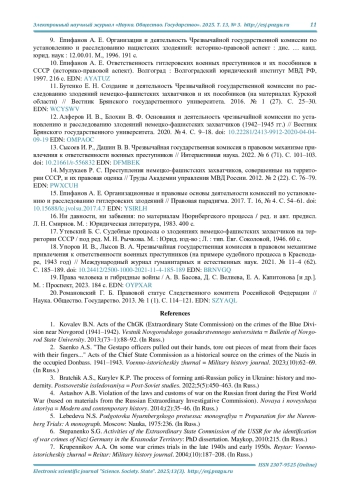 15. Епифанов А. Е. Организационные и правовые основы деятельности комиссий по установлению и расследованию гитлеровских злодеяний // Правовая парадигма. 2017. Т. 16, № 4. С. 54-61. DOI: 10.15688/lc.jvolsu.2017.4.7 EDN: YSIRLH