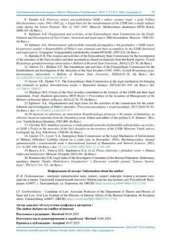 12. Алферов И. В., Блохин В. Ф. Основания и деятельность чрезвычайной комиссии по установлению и расследованию злодеяний немецко-фашистских захватчиков (1942-1945 гг.) // Вестник Брянского государственного университета. 2020. № 4. С. 9-18. DOI: 10.22281/2413-9912-2020-04-04-09-19 EDN: OMPAOC