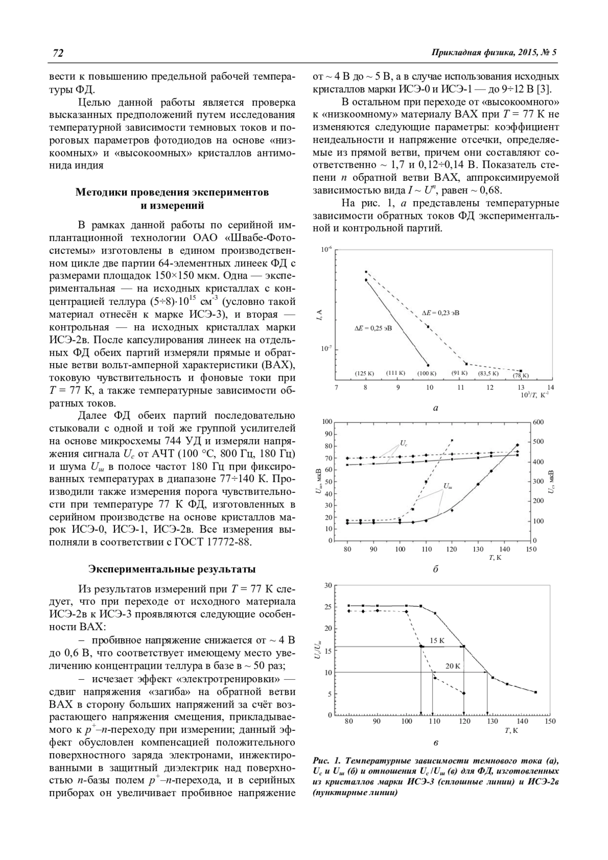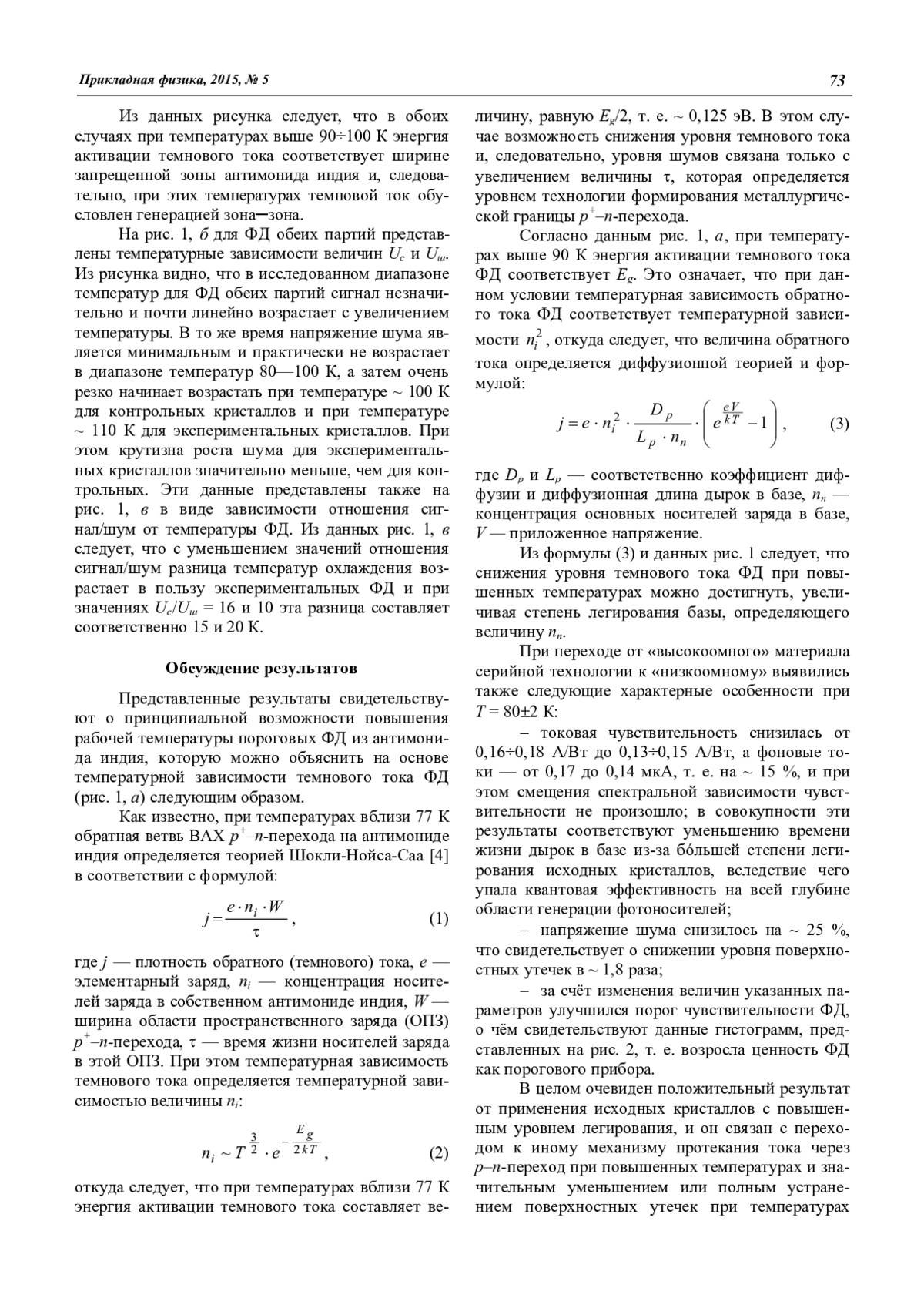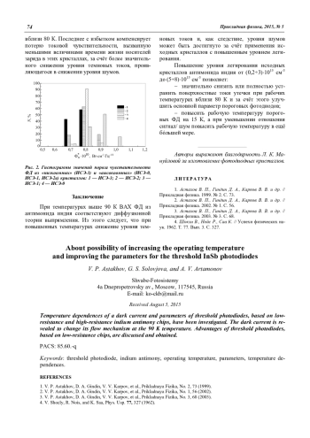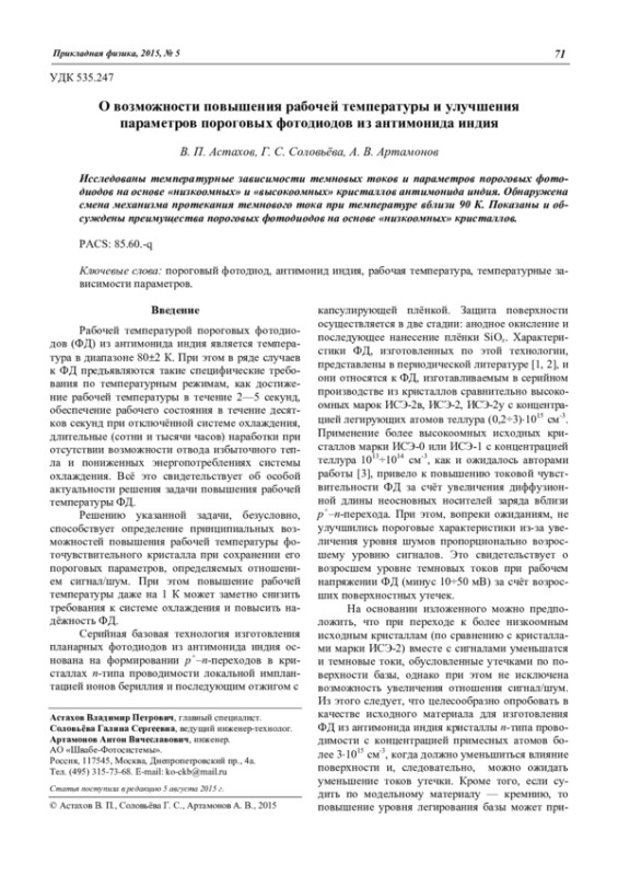 Астахов В. П., Соловьёва Г. С., Артамонов А. В. О возможности повышения рабочей температуры и улучшения параметров пороговых фотодиодов из антимонида индия 71