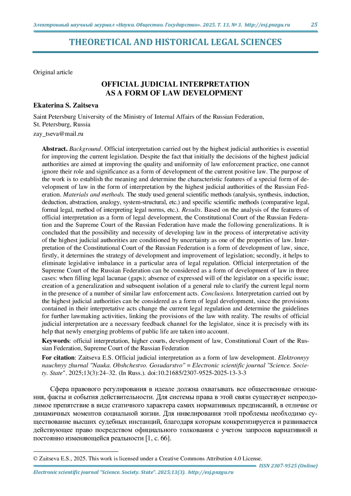 Результаты. По итогам анализа особенности официального толкования как формы развития права Конституционным Судом Российской Федерации и Верховным Судом Российской Федерации представлены следующие обобщения. Сделан вывод, что возможность и необходимость развития права в процессе осуществления интерпретационной деятельности высших судебных инстанций обусловлены неопределенностью как одним из свойств права. Толкование Конституционного Суда Российской Федерации является формой развития права, поскольку, во-первых, определяет стратегию развития и совершенствования законодательства; во-вторых, способствует устранению законодательного дисбаланса на том или ином участке правового регулирования. Официальное толкование Верховного Суда Российской Федерации может рассматриваться как форма развития права в трех случаях: при восполнении правовых лакун (пробелов); отсутствии выраженной воли законодателя по конкретному вопросу; создании обобщения и последующем вычленении общего правила для уточнения действующей правовой нормы при наличии целого ряда однотипных правоприменительных актов.