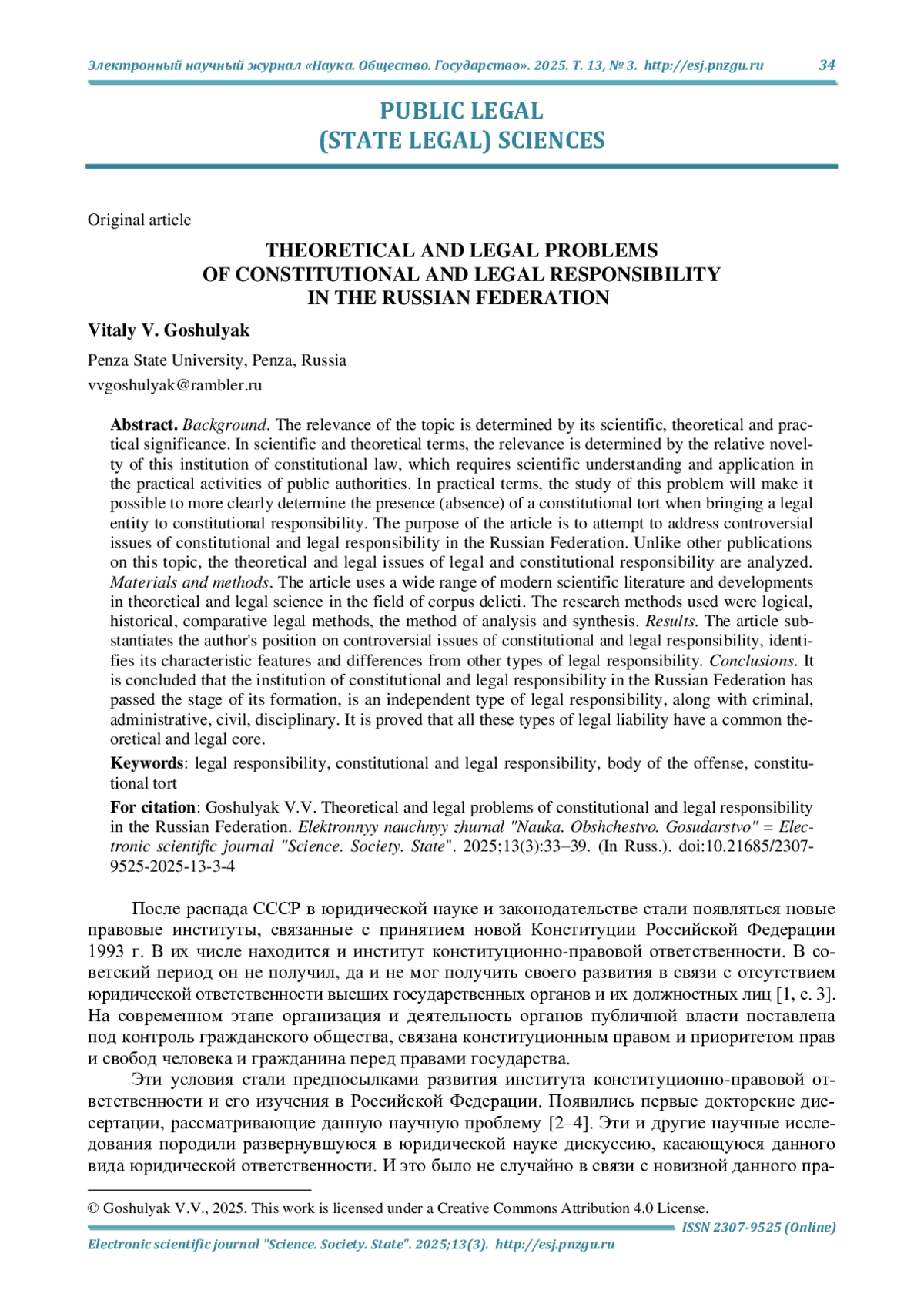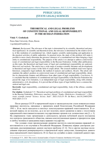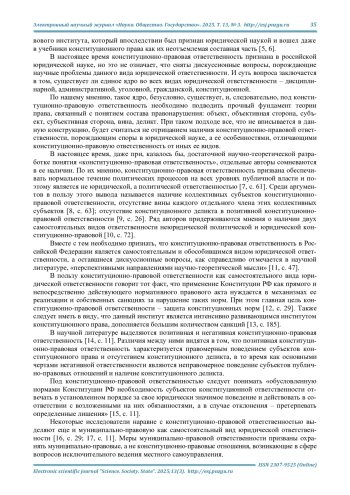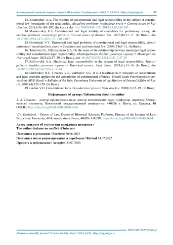 15. Гошуляк В. В. Теоретико-правовые проблемы конституционно-правовой ответственности // Конституционное и муниципальное право. 2009. № 24. С. 9-12. EDN: KYOOTD