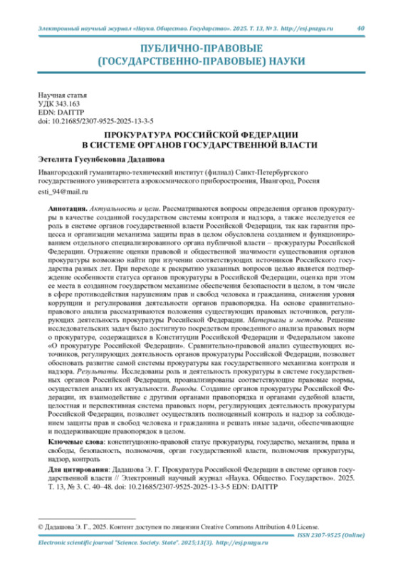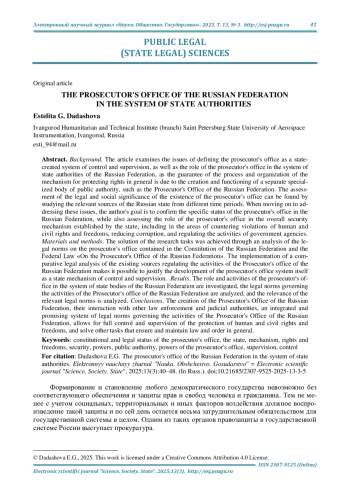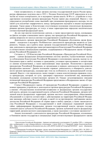 1. Чалых Я. С. Роль прокуратуры Российской Федерации в системе публичной власти в контексте ее исторического развития // ExLegis: правовые исследования. 2024. № 2. С. 33-36. EDN: KOAPXX