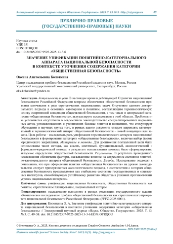 Актуальность и цели. Проблема обеспечения общественной безопасности представляет собой одну из приоритетных областей научных исследований. В этой связи возникает объективная потребность в совершенствовании методологических подходов и теоретико-правового инструментария в исследовании вопросов обеспечения общественной безопасности. Проведение комплексного анализа механизма обеспечения общественной безопасности позволяет углубить знания в области разработки концептуальных моделей и методов организации системы общественной безопасности. Однако подавляющее большинство исследователей ограничивается лишь описанием отдельных компонентов указанного механизма либо акцентирует внимание исключительно на проблематике реализации мер правового реагирования, тогда как вопрос формирования целостной понятийно-категориальной базы остается недостаточно изученным и требует дополнительного научного осмысления. Целью данного исследования является уточнение базовых категорий национально-государственной идентичности в контексте исследования проблем общественной безопасности.