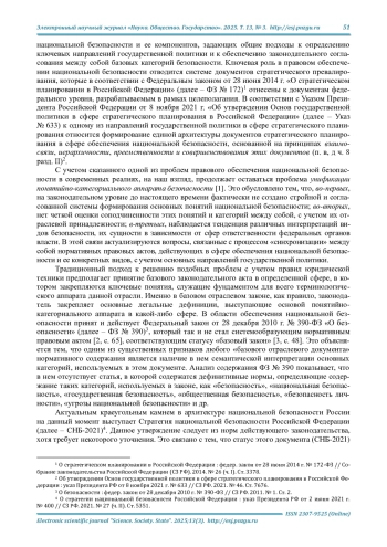 В условиях современной России вопросы гарантирования национальной безопасности и выработки ключевых стратегических директив в этой области регламентируются нормами межотраслевого законодательства. Это требует систематической разработки и утверждения нормативных правовых актов, включая документы стратегического значения по вопросам национальной безопасности и ее компонентов, задающих общие подходы к определению ключевых направлений государственной политики и к обеспечению законодательного согласования между собой базовых категорий безопасности.