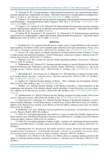 11. Гирько С. И. Концептуальные подходы и поиск вектора совершенствования научного обеспечения проблем национальной безопасности Российской Федерации // Научный портал МВД России. 2024. № 3 (67). С. 28-34. EDN: SIMEDL