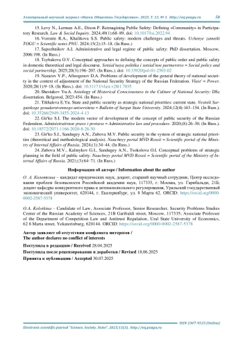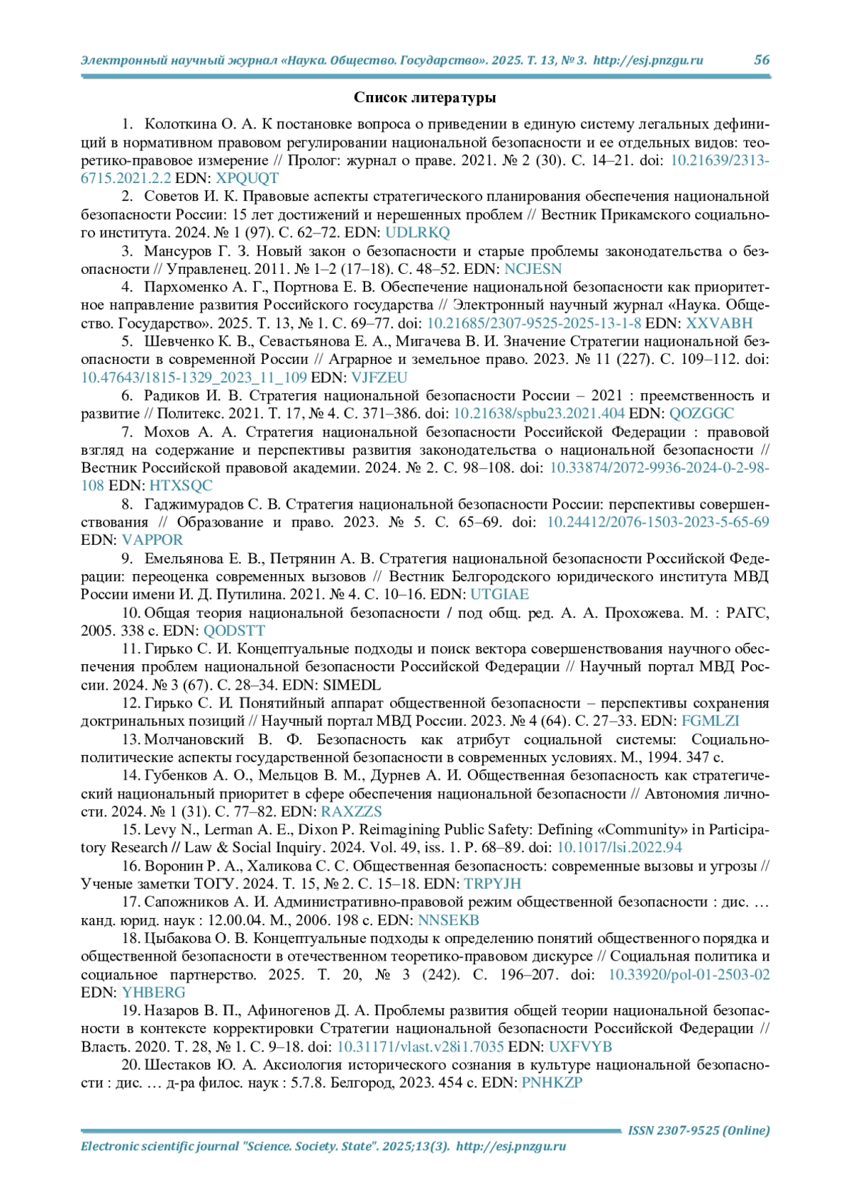 18. Цыбакова О. В. Концептуальные подходы к определению понятий общественного порядка и общественной безопасности в отечественном теоретико-правовом дискурсе // Социальная политика и социальное партнерство. 2025. Т. 20, № 3 (242). С. 196-207. DOI: 10.33920/pol-01-2503-02 EDN: YHBERG