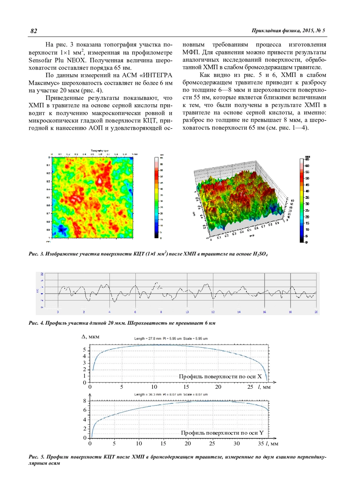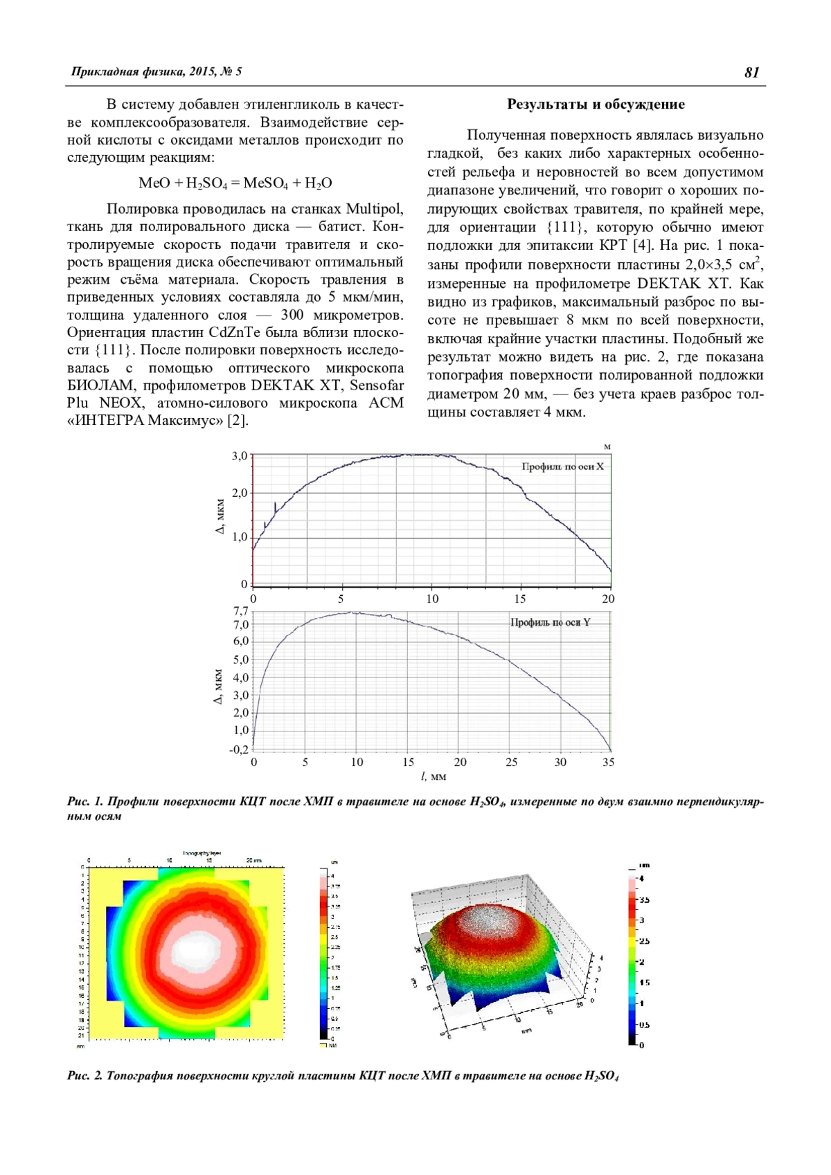 Приведены результаты исследования характеристик поверхности теллурида кадмия-цинка ориентации {111} после химико-механической полировки с использованием полирующего травителя на основе серной кислоты. Наличие полирующего эффекта травления устанавливалось наблюдением поверхности образцов после химико-механической полировки с помощью атомно-силовой микроскопии (АСМ) и профилометров. Шероховатость профилей поверхности определялись при помощи анализа АСМ изображений и профилограмм.