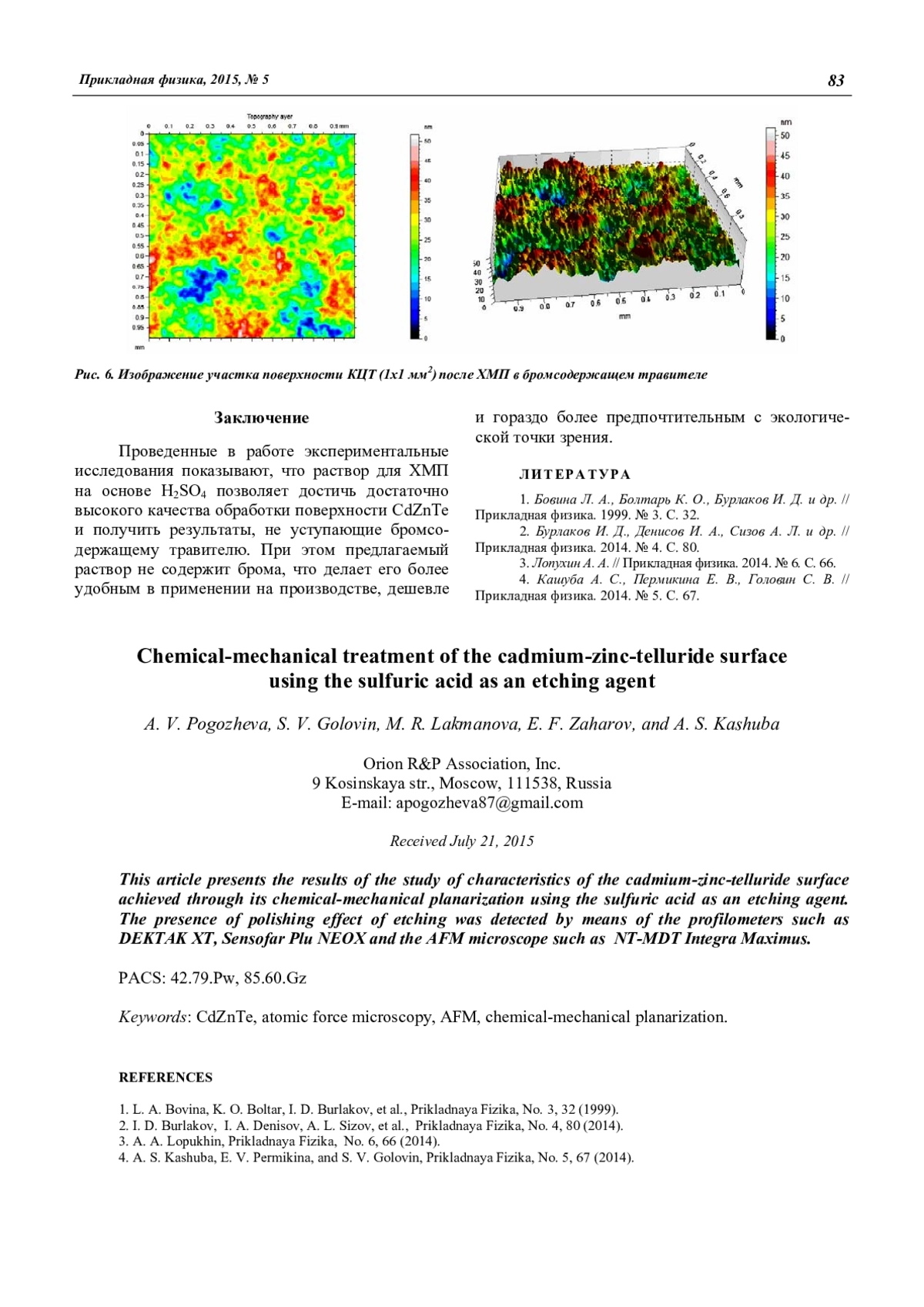 A. V. Pogozheva, S. V. Golovin, M. R. Lakmanova, E. F. Zaharov, and A. S. Kashuba Сhemical-mechanical treatment of the cad-mium-zinc-telluride surface using the sulfuric acid as an etching agent 80