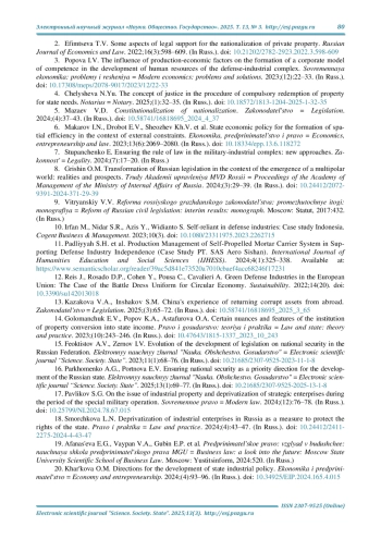 2. Ефимцева Т. В. Некоторые аспекты правового обеспечения национализации частной собственности // Russian Journal of Economics and Law. 2022. Т. 16, № 3. С. 598-609. DOI: 10.21202/2782-2923.2022.3.598-609 EDN: TUZANE
