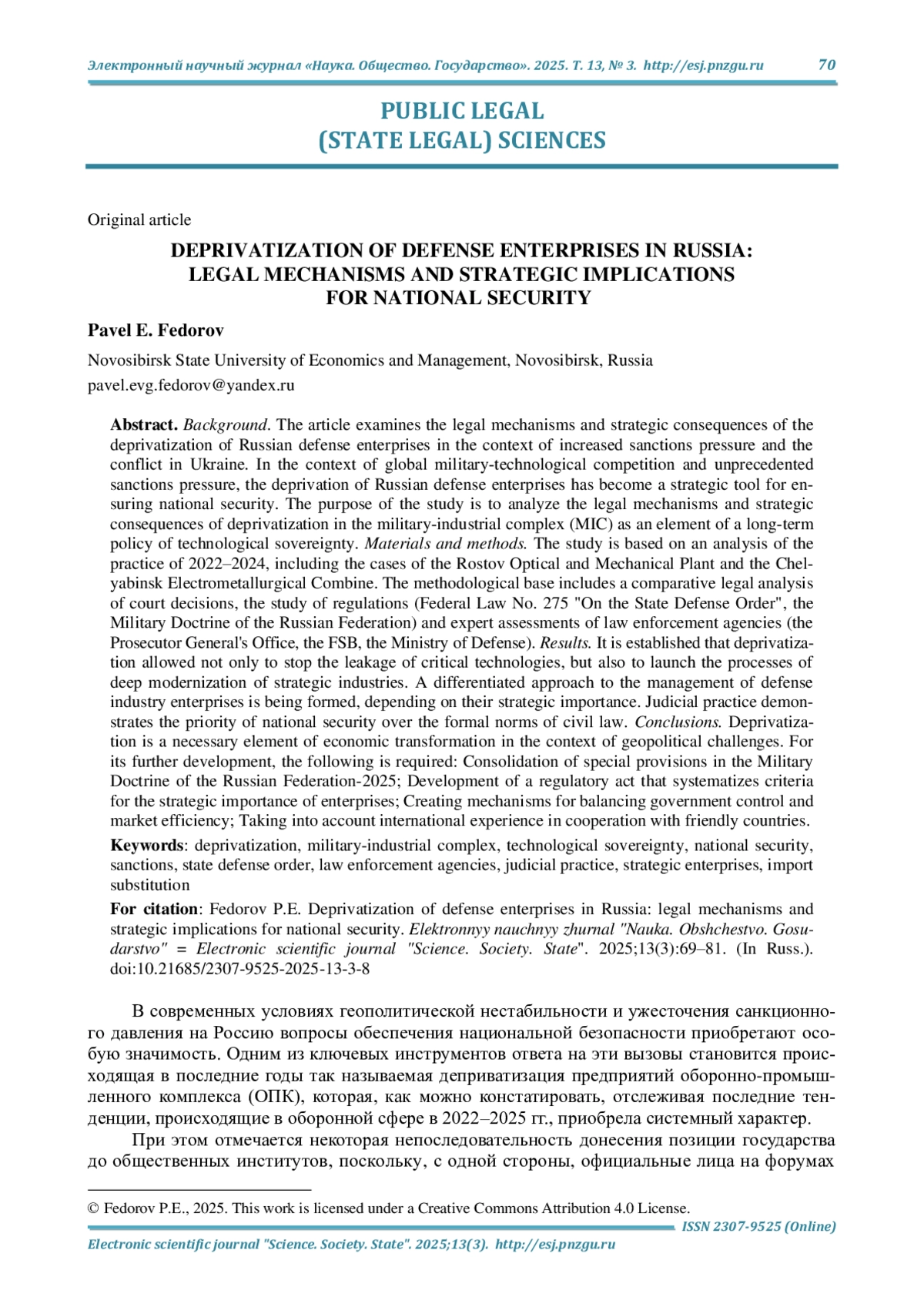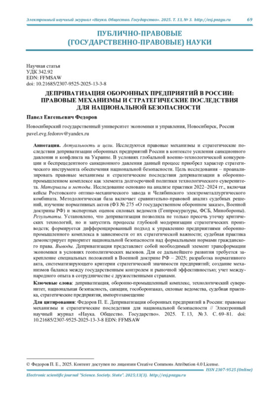 Актуальность и цели. Исследуются правовые механизмы и стратегические последствия деприватизации оборонных предприятий России в контексте усиления санкционного давления и конфликта на Украине. В условиях глобальной военно-технологической конкуренции и беспрецедентного санкционного давления данный процесс приобрел характер стратегического инструмента обеспечения национальной безопасности. Цель исследования - проанализировать правовые механизмы и стратегические последствия деприватизации в оборонно-промышленном комплексе как элемента долгосрочной политики технологического суверенитета.