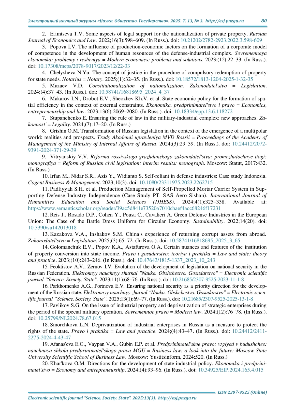 17. Павликов С. Г. К вопросу о промышленной собственности и деприватизации стратегических предприятий в период проведения СВО // Современное право. 2024. № 12. С. 76-78. DOI: 10.25799/NI.2024.78.67.015 EDN: NZOFZZ