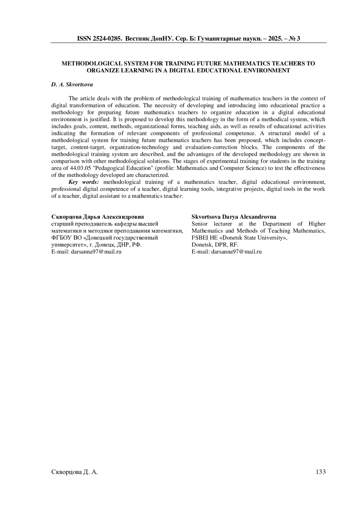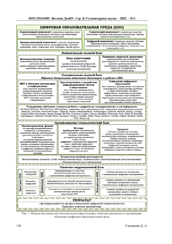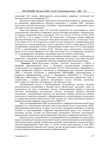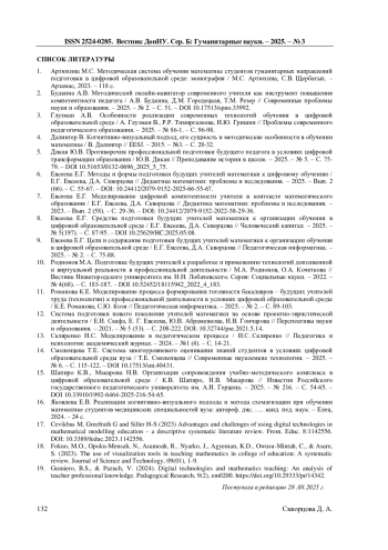 6. Евсеева Е.Г. Методы и формы подготовки будущих учителей математики к цифровому обучению / Е.Г. Евсеева, Д.А. Скворцова // Дидактика математики: проблемы и исследования. - 2025. - Вып. 2 (66). - С. 55-67. -. DOI: 10.24412/2079-9152-2025-66-55-67 EDN: ZPWMZC