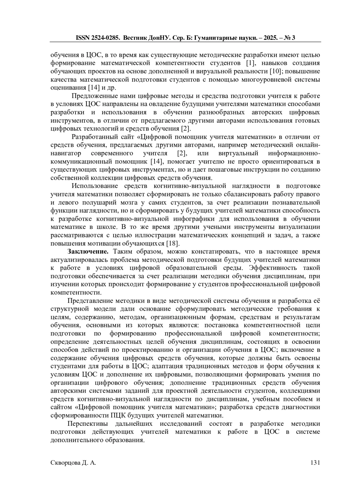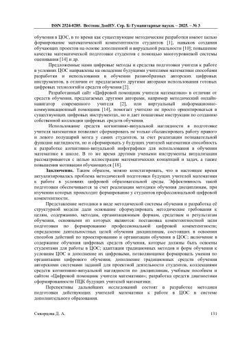 5. Дикая Ю.В. Противоречия профессиональной подготовки будущего педагога в условиях цифровой трансформации образования / Ю.В. Дикая // Преподавание истории в школе. - 2025. - № 5. - С. 75-79. DOI: 10.51653/0132-0696_2025_5_75 EDN: AJSOIJ