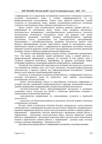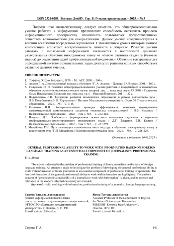 6. Ващенко Д.Г. Особенности формирования ценностного отношения студентов к изучению профессионально-ориентированного иностранного языка / Д.Г. Ващенко, В.В. Кольга // Педагогическое образование. - 2022. - Том 3, №5. - С. 257-259. EDN: QEBVJM