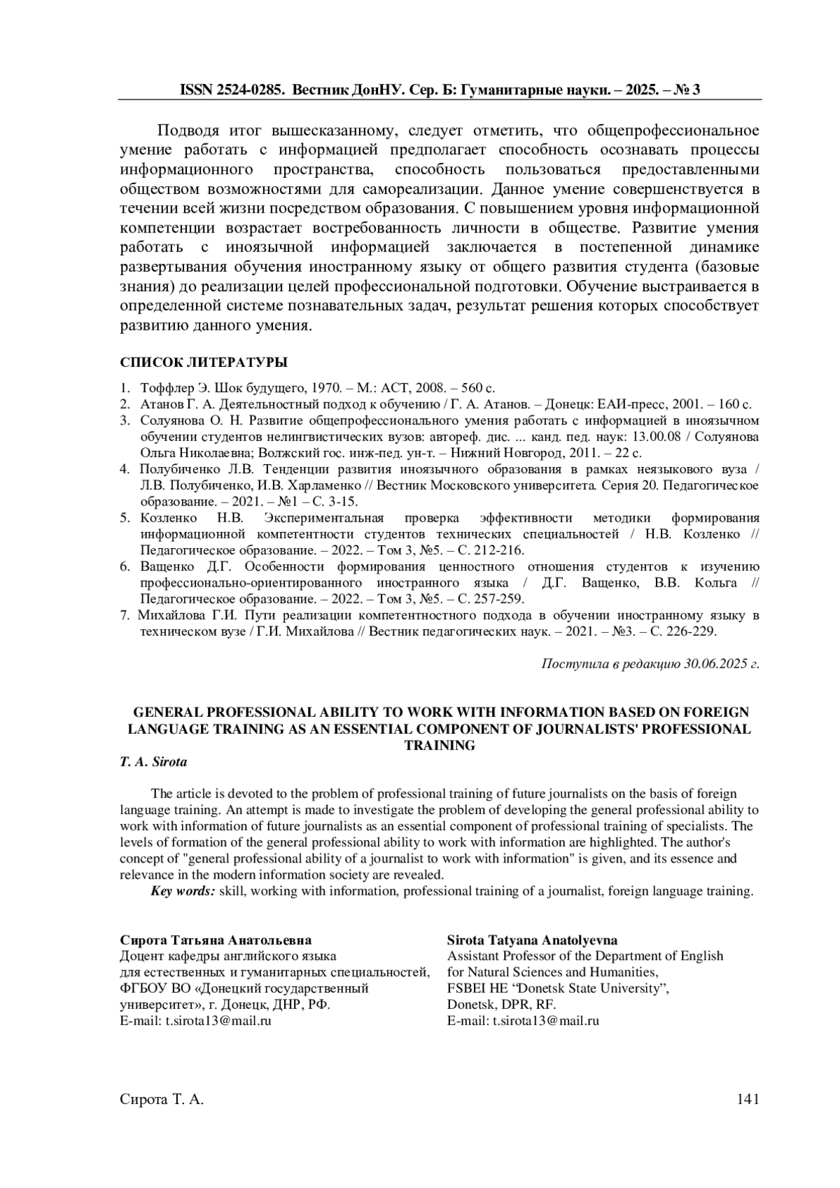 4. Полубиченко Л.В. Тенденции развития иноязычного образования в рамках неязыкового вуза / Л.В. Полубиченко, И.В. Харламенко // Вестник Московского университета. Серия 20. Педагогическое образование. - 2021. - №1 - С. 3-15. EDN: IVMMER